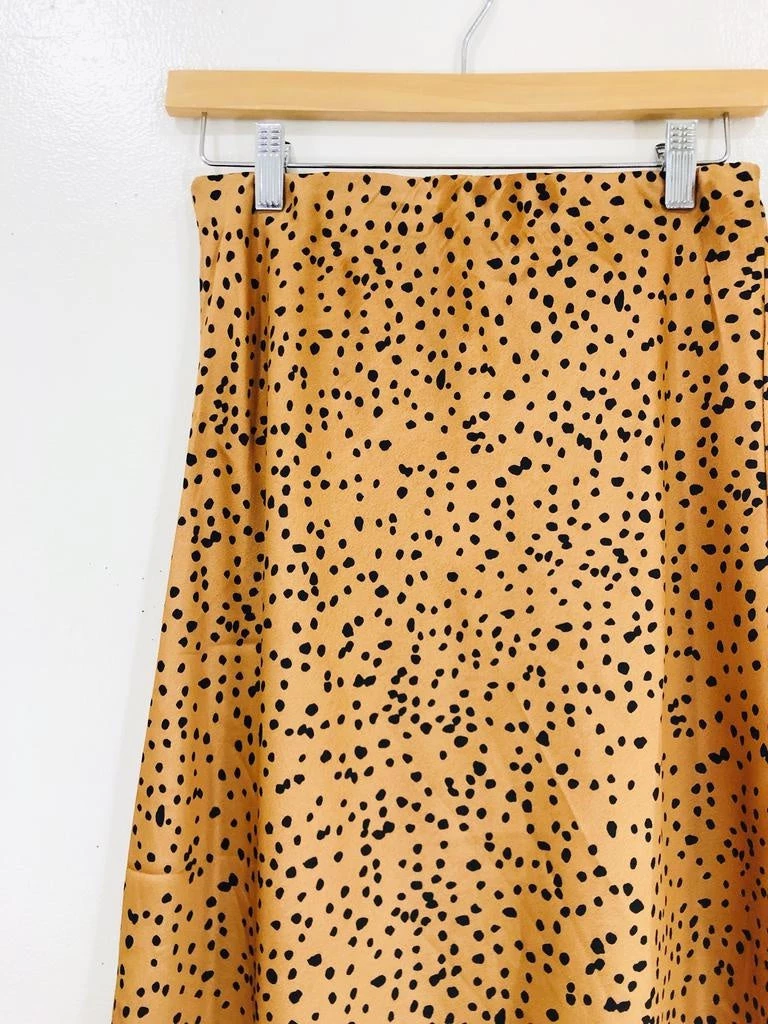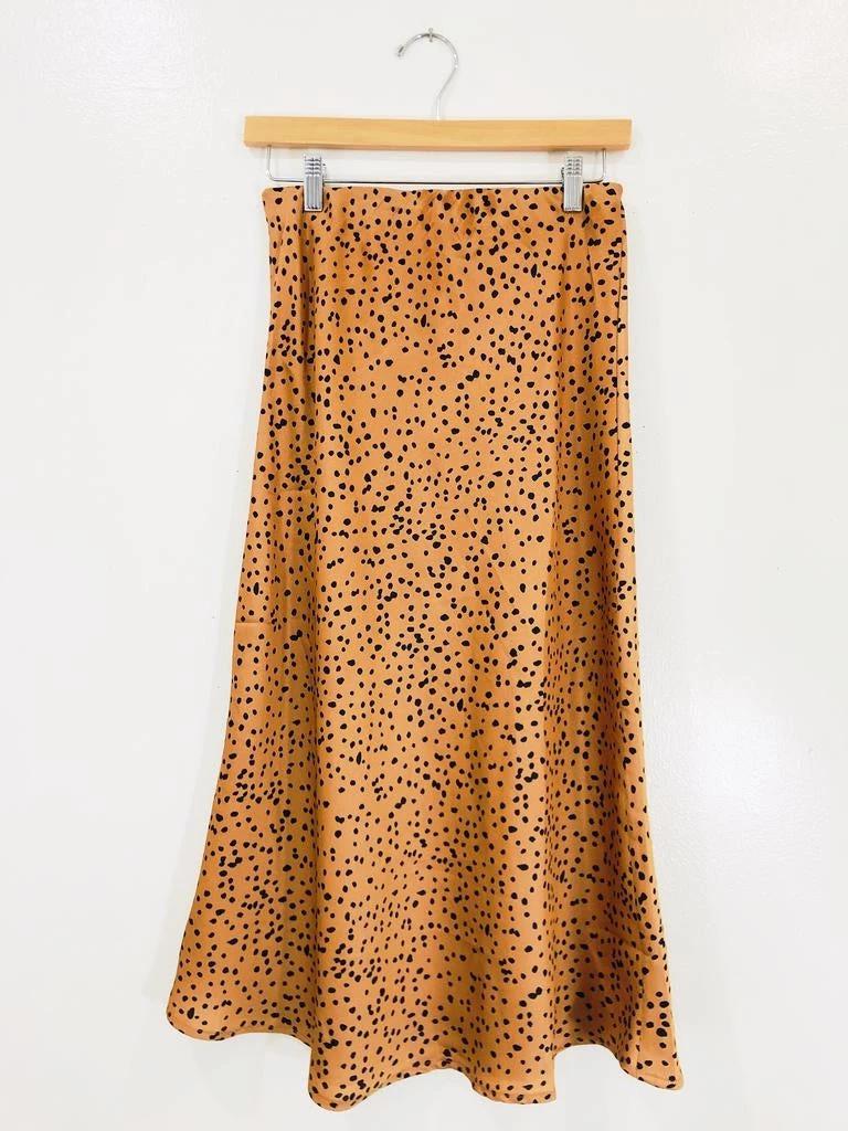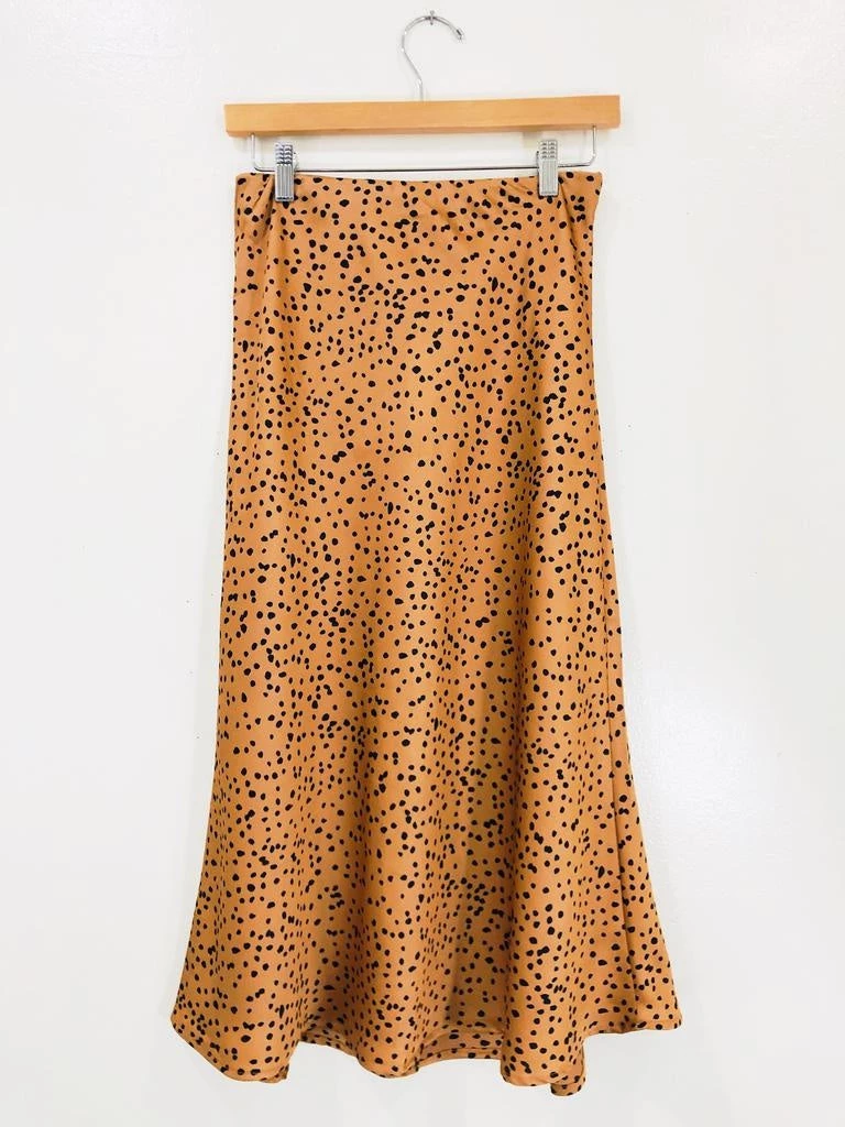 The Spot On Midi Skirt is our go to piece this season. We love it paired with a graphic tee and sneaks or dressed up with booties and a bodysuit. This copper spotted satin skirt has an elastic waist, loose fit and midi length. Fits true to size.