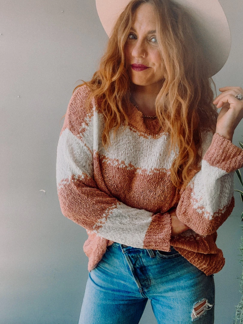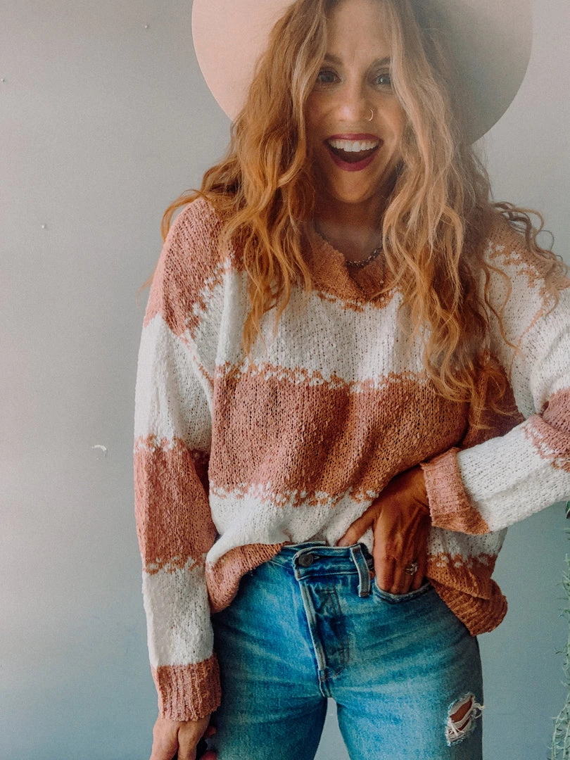 The Creamsicle Color Block Sweater is a yummy, thicker weave color-block sweater in a pretty, muted peach and white. Love this paired with all your favorite high waisted denim (especially light wash) and perfect for a beach throw on when it gets a bit chilly!!