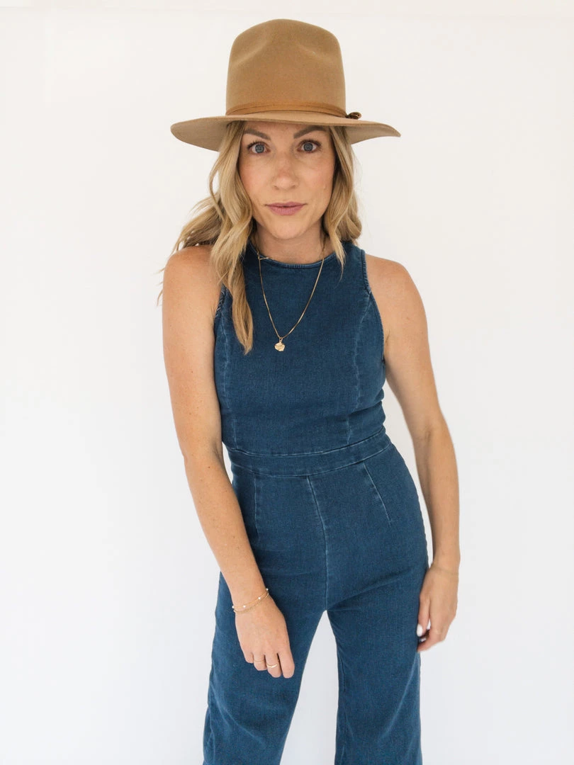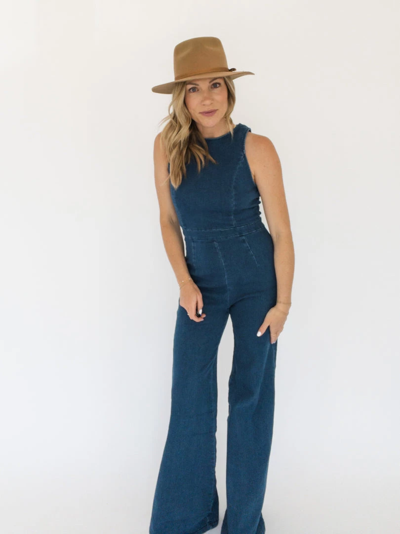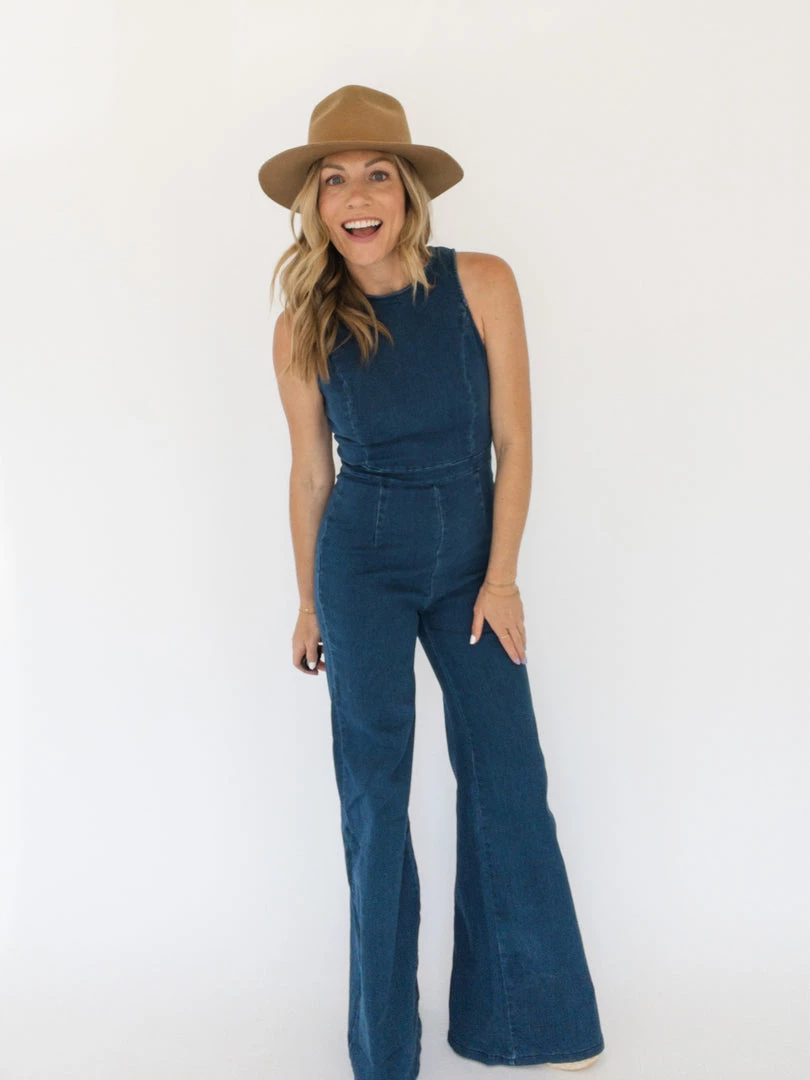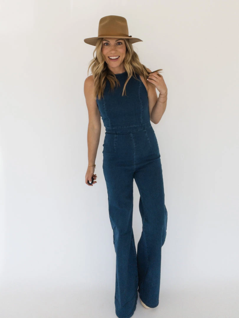 This stretchy denim jumpsuit is a timeless staple. It features a high neckline with a zipper up the back, a long flare leg, and seam detailing in the bust and waist.