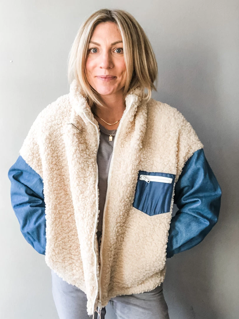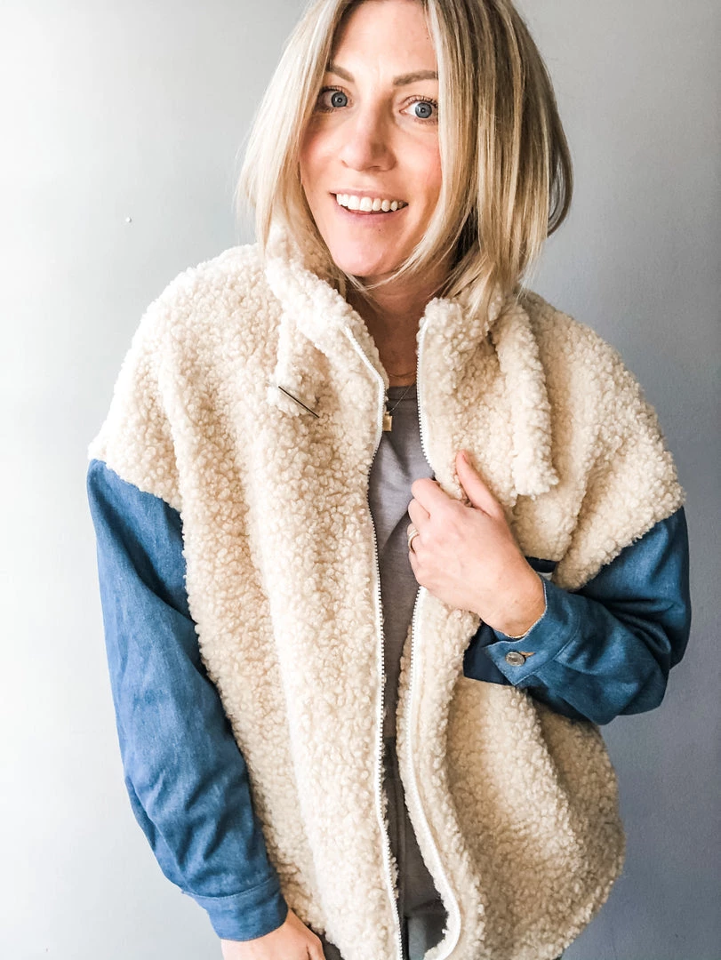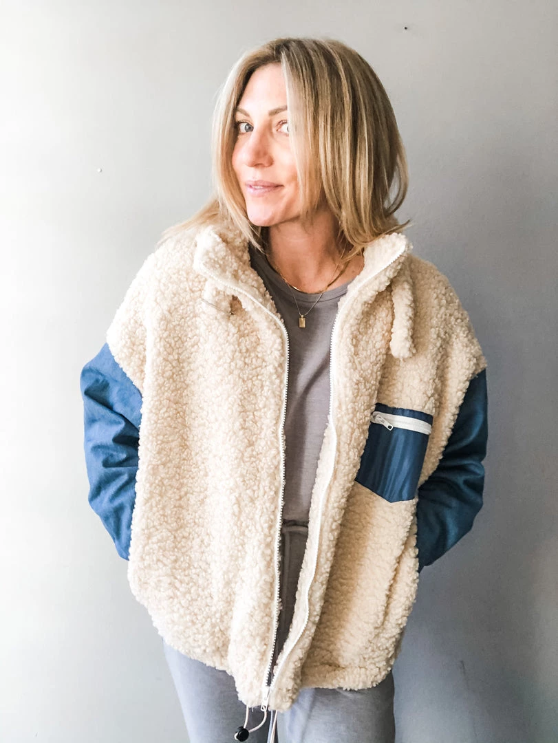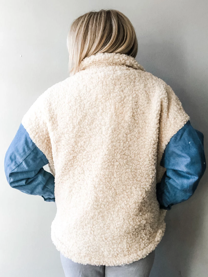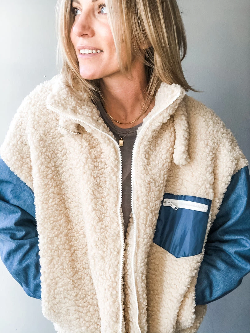 A fun jacket with sherpa body and denim sleeve contrast that is light weight enough to throw on during cool weather but roomy enough for layering. Such a unique piece with a western vibe. Front zipper closure, drawstring waistband, single front breast pocket with zipper closure and buckle closure detail at the neck.