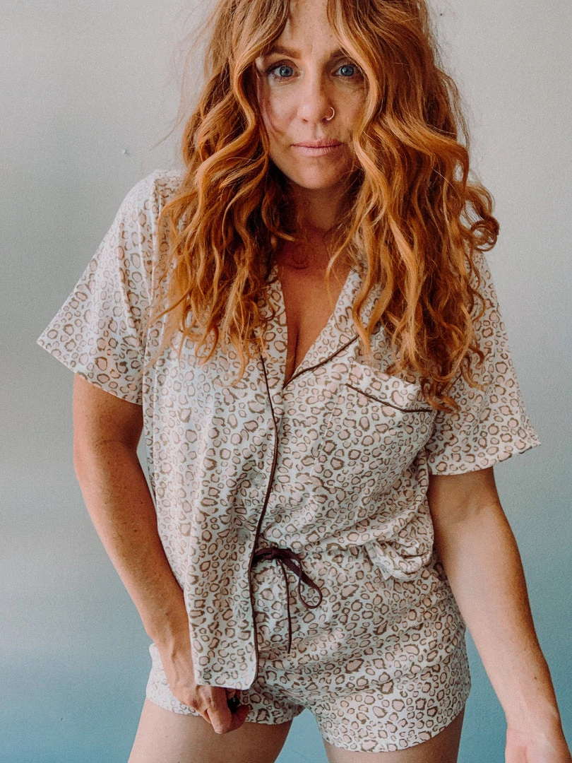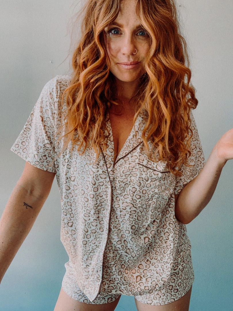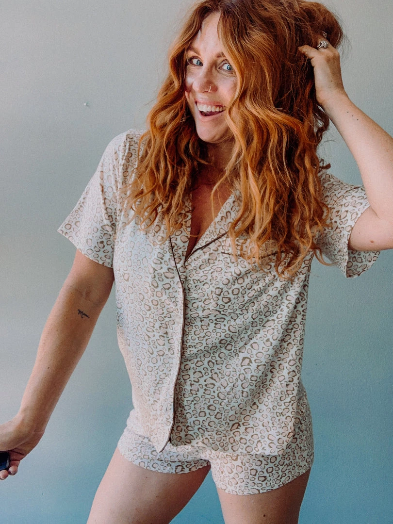 This pajama set is not only cute as could be, but it is SOOOO soft!! Like so soft. A looser fitting button up short sleeve top with a side pocket and a super comfy and flattering short with drawstring and elastic waistline. So easy for lounging and girls nights in!