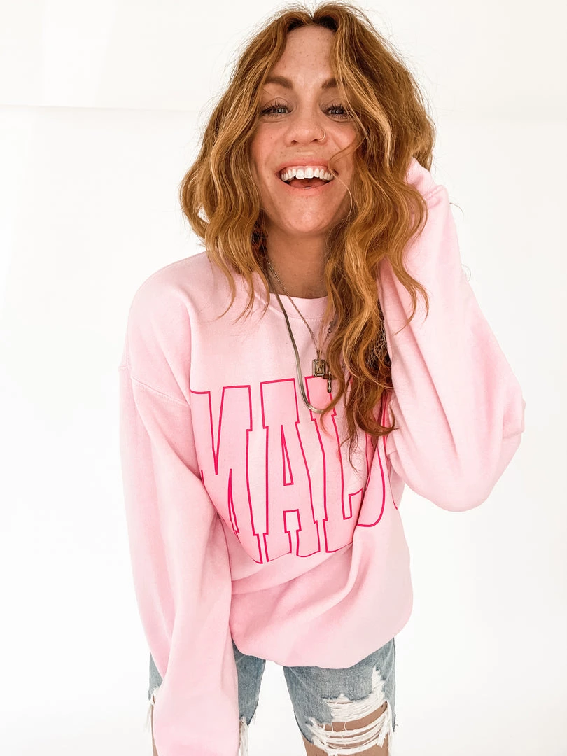 A fun oversized crewneck sweatshirt in a bubble gum pink with pink Malibu graphic! Love this paired with your cutoff shorts for a chill beach day vibe that’s cozy as could be.