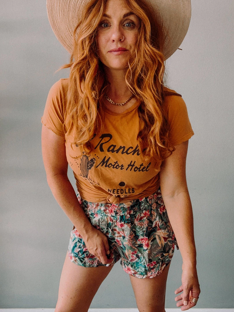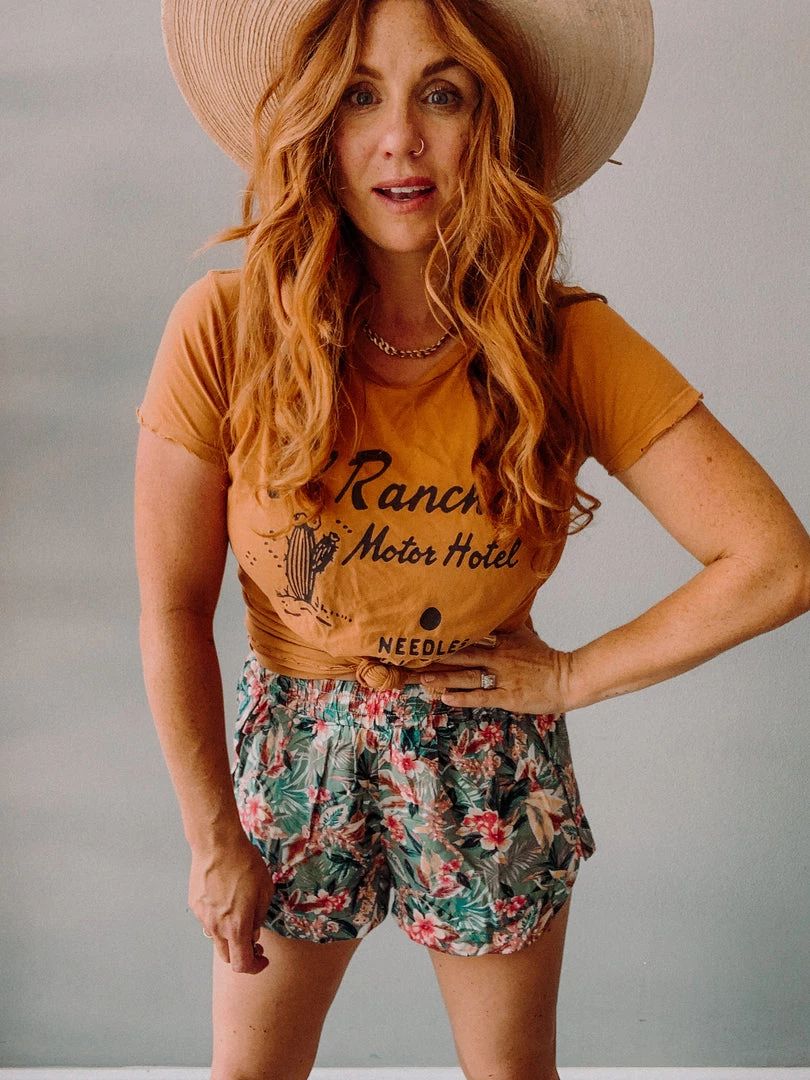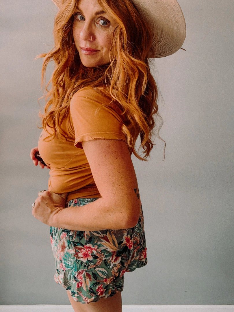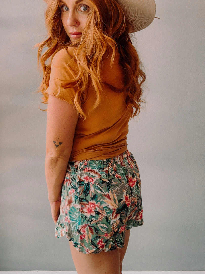 The Mayflower Shorts are an easy, loose fit with a higher elastic waistline. These fun floral shorts fit like an old school track short and look great with your fav graphic, an easy basic, or a fitted bodysuit!