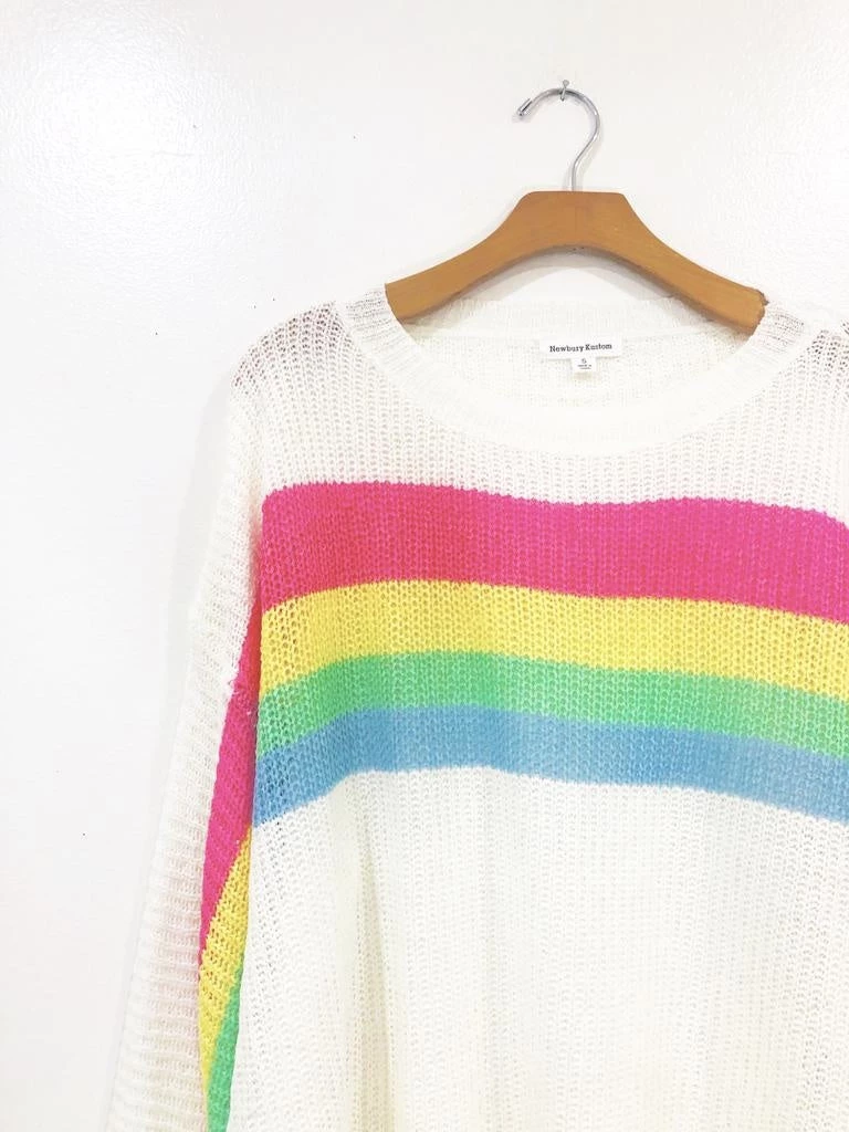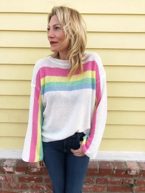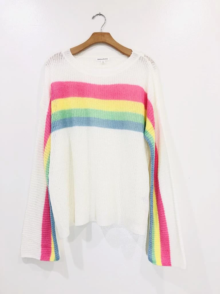 Bring a little sunshine into your life with this rainbow striped knit top. A loose pullover sweater with flare sleeve and crew neck. This knit is slightly sheer and lightweight which makes it such an easy top to toss over your best bralette or fav ‘kini.