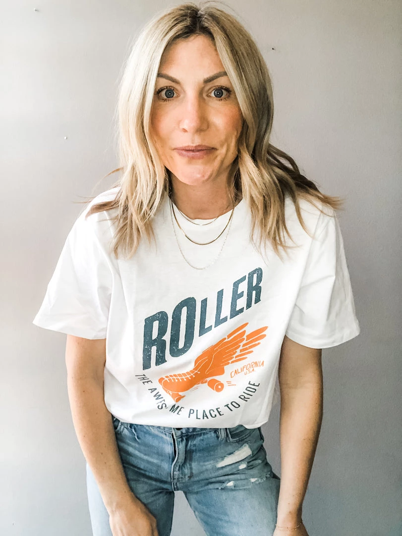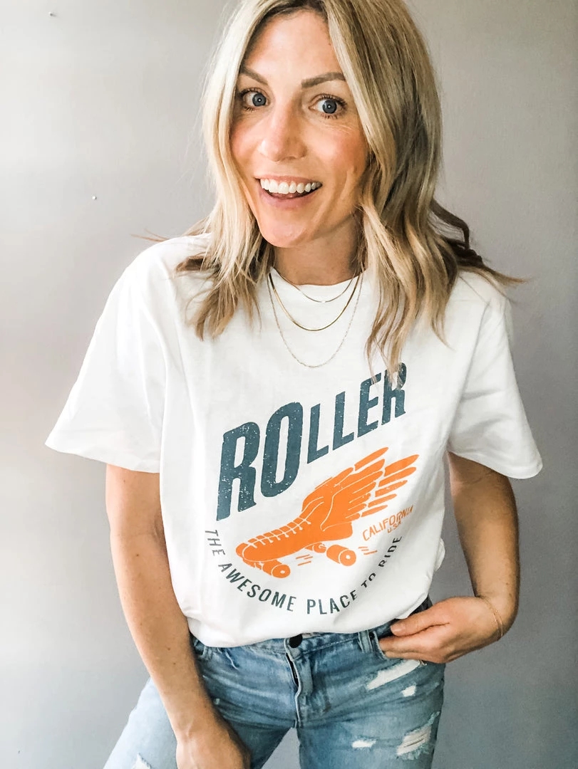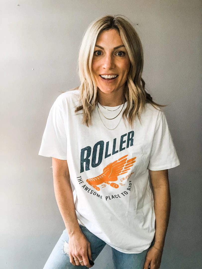 Busting out the skates and taken this retro oversized graphic tee to the rink! Fun roller graphic that can be paired with bikes shorts to your fav cutoffs. Tuck in or wear loose with your fav denim. Guaranteed to be one of your fav tees!