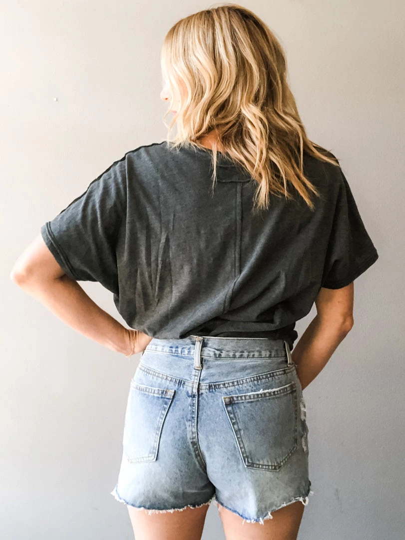 A high waisted denim short with raw edge hemline perfect for all the summer things. An easy to pair and wear denim that runs true to size. Zipper front with button closure.