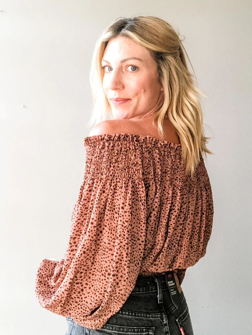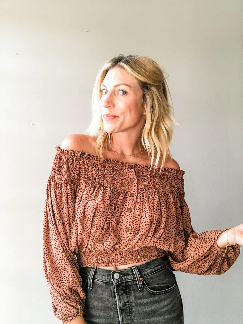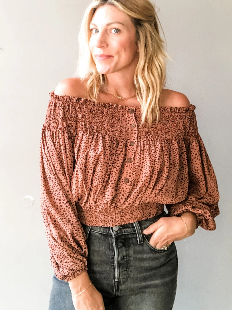 A crop, off the shoulder top with all over leopard print. A fun pop for any occasion! We love the smocking at the top and bottom hem, button front detail and loose sleeves. Pictured with the Levi’s Wedgie for a look that is perfect for a night out.