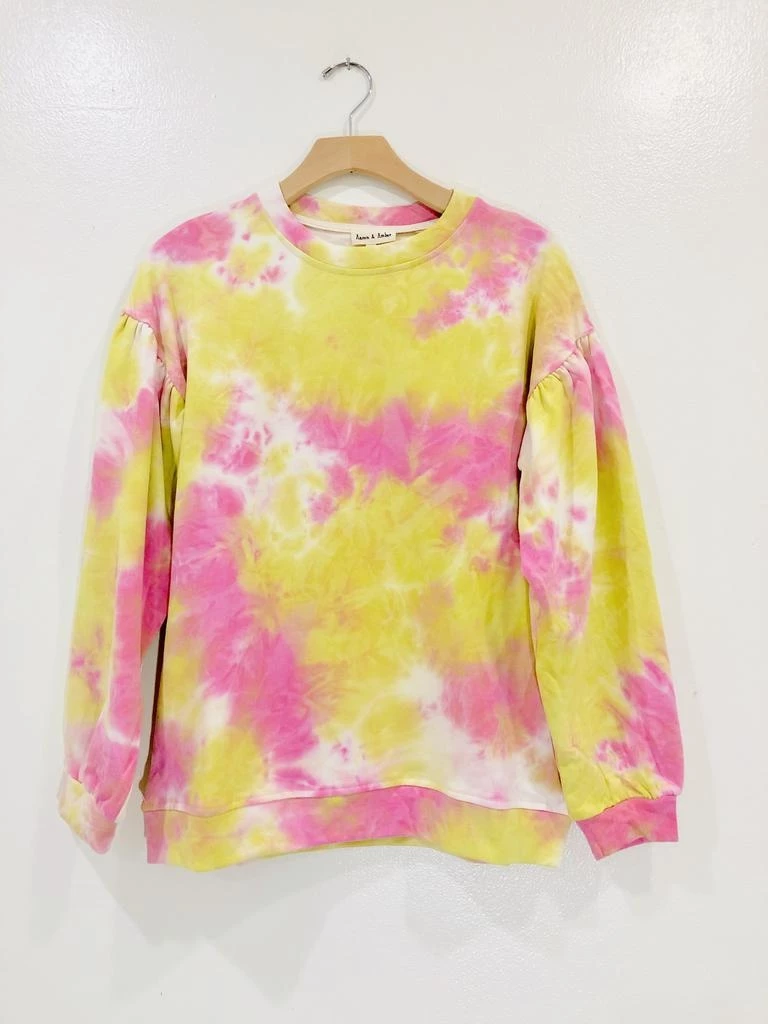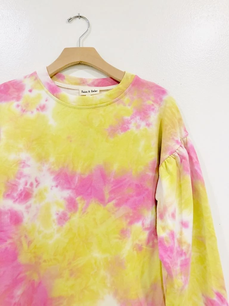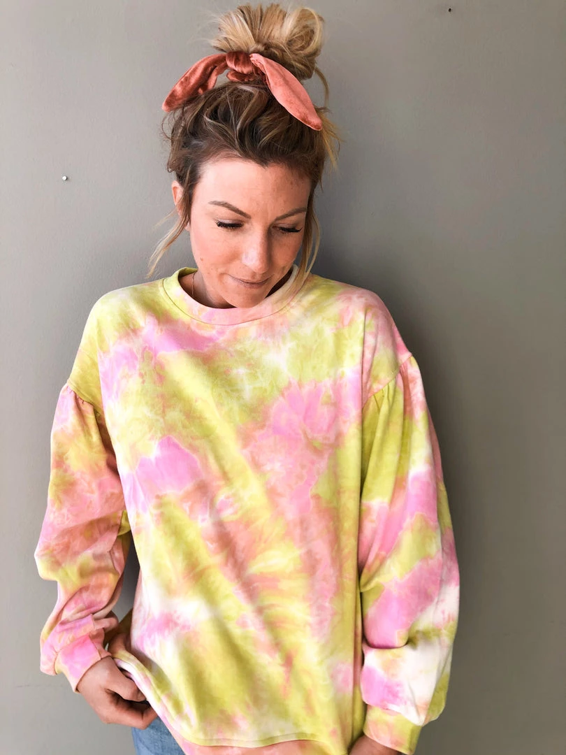 We love the laidback Cali vibes of this tie dye sweater. A yellow and pink tie wash with crew neck and bishop style sleeves. This guy fits comfy on and has plenty of room in the arms and body.