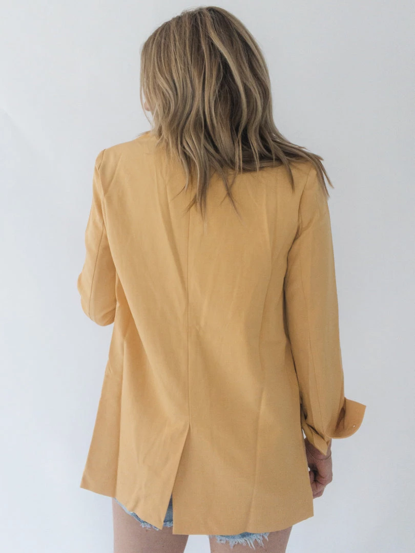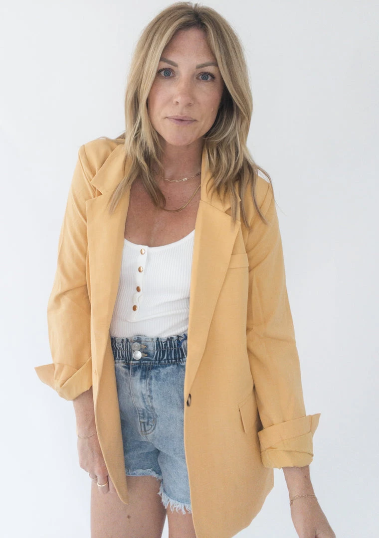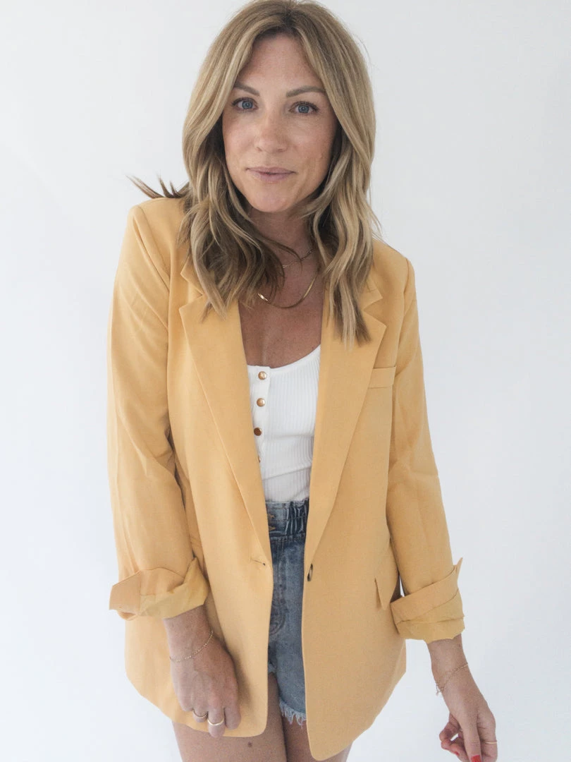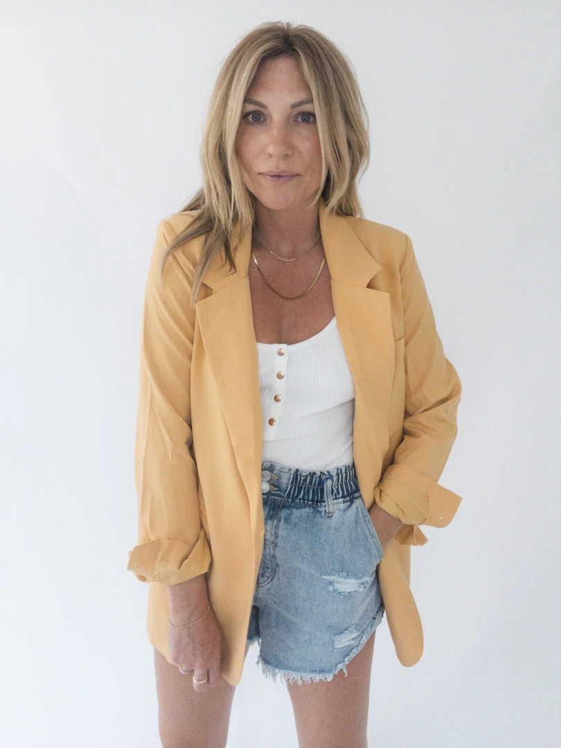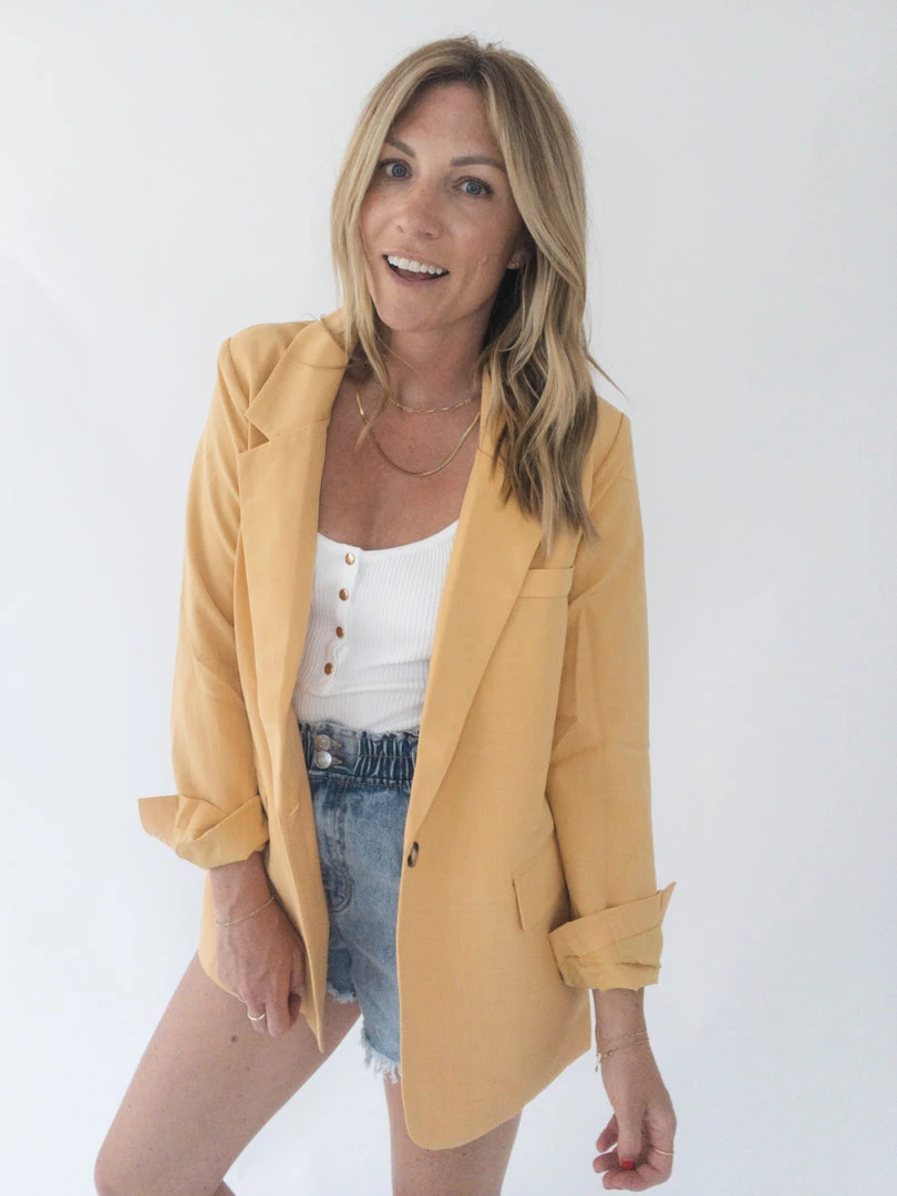 For business or pleasure, or dare we say… both?! This blazer has full-length sleeves that look great rolled or scrunched up, a single tortoise button, and pocket flaps. It’s vibrant tangerine colorway brings any outfit to life, and we love it paired with denim and a plain tank or rocked over a graphic tee. It also has a soft, silky lining that makes wearing it feel as great as it looks.