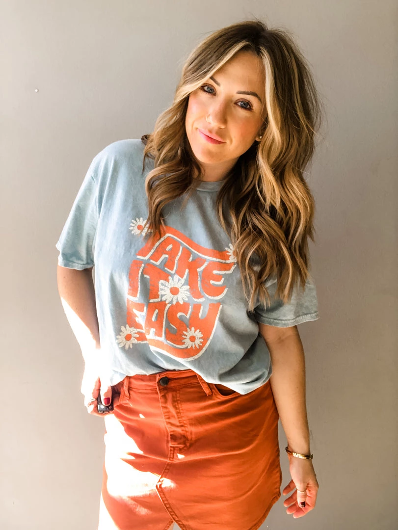 Take It Easy, Girl. Love a good graphic tee with an even better message. This oversized tee is in a fun hazy blue with a vintage looking graphic. Meant to be oversized. Tuck in or tie up with denim or pair with bike shorts. A great tee that can be worn year round.