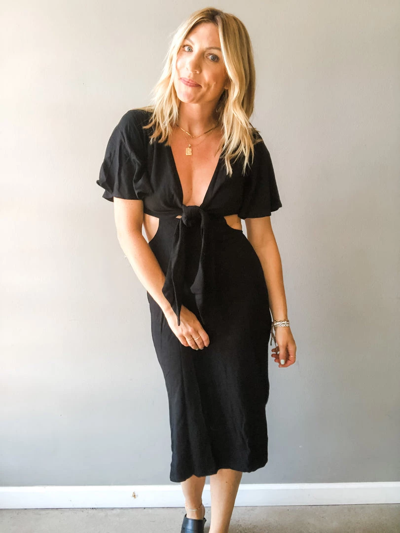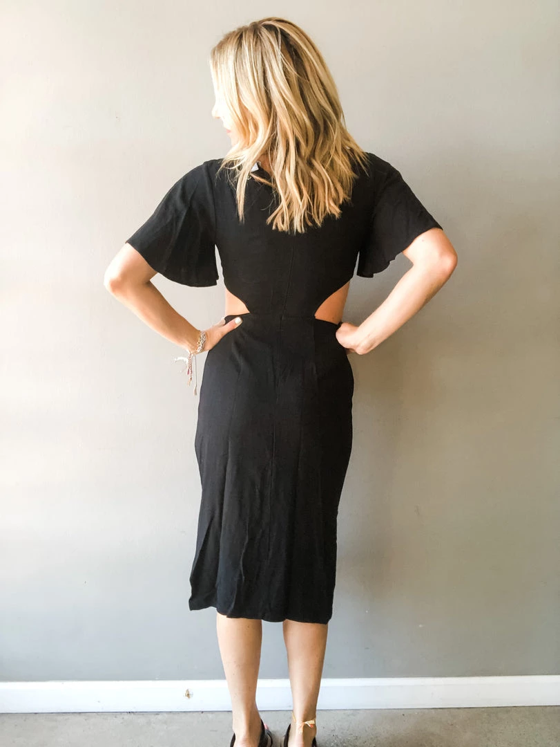 The Tati Midi Dress is a cut out, wrap tie, flutter sleeve midi dress that we absolutely adore!! Great for a special occasion or tropical vacation or night on the town. This flirty little number shows just enough skin in a super flattering silhouette.