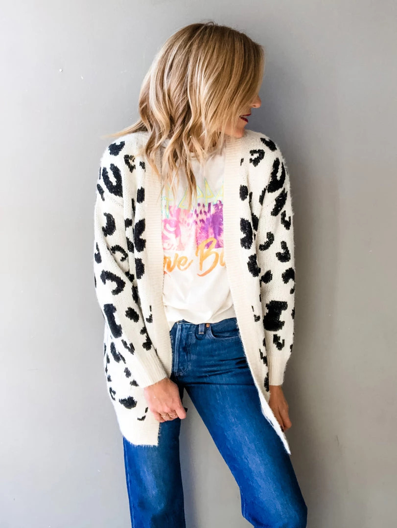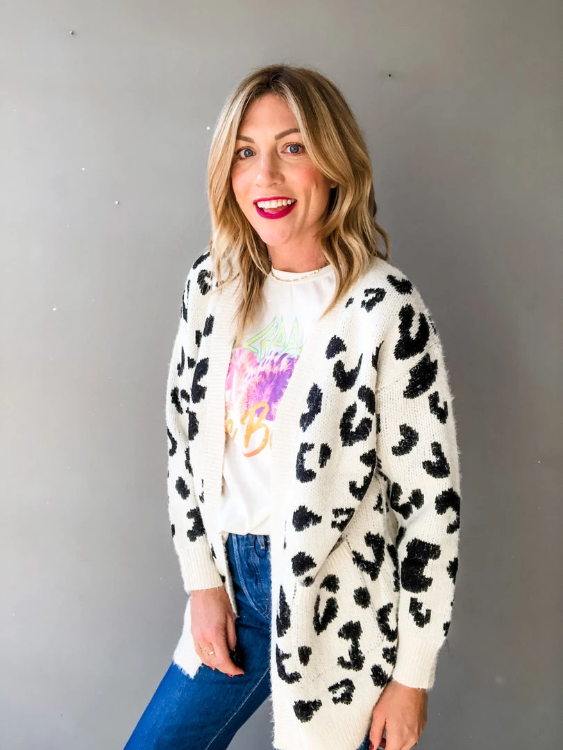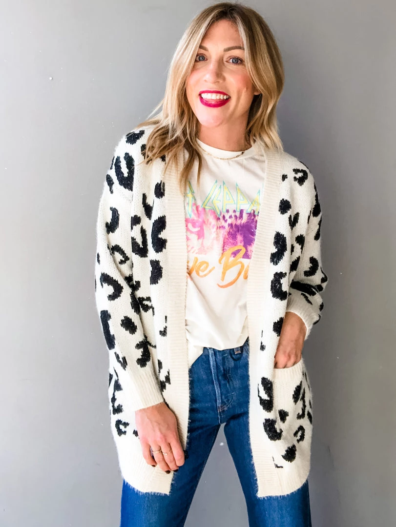 Loving on this white knit leopard cardigan! A great pop to any outfit. Ribbed trim and side pockets. Dress up or down and great for any age.