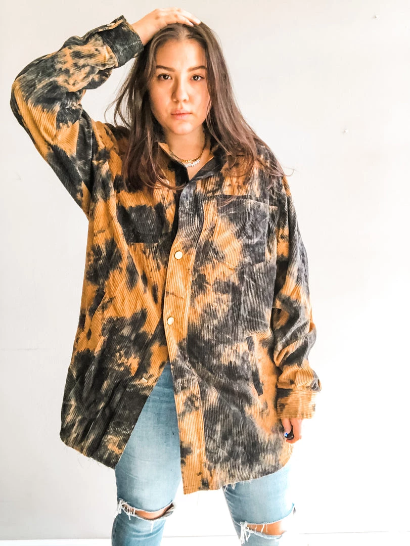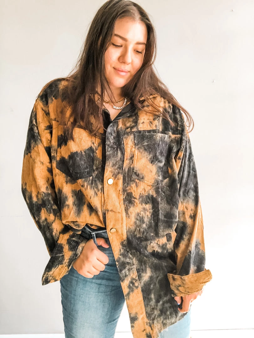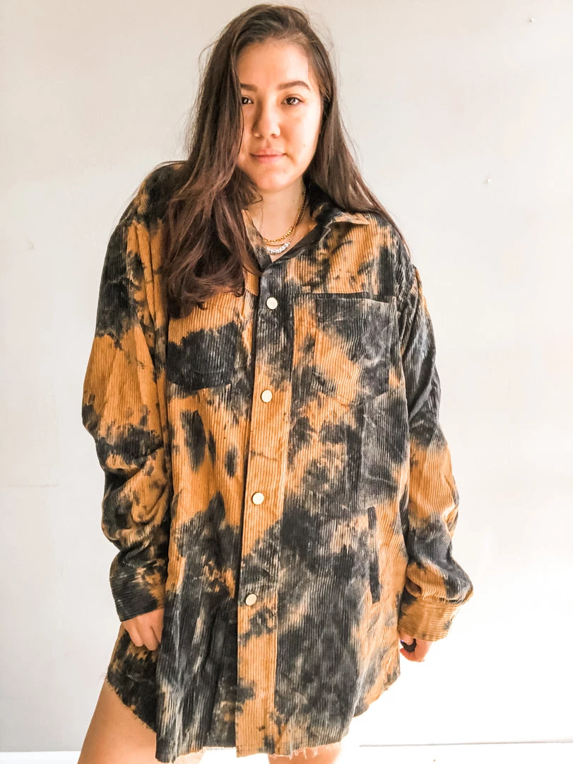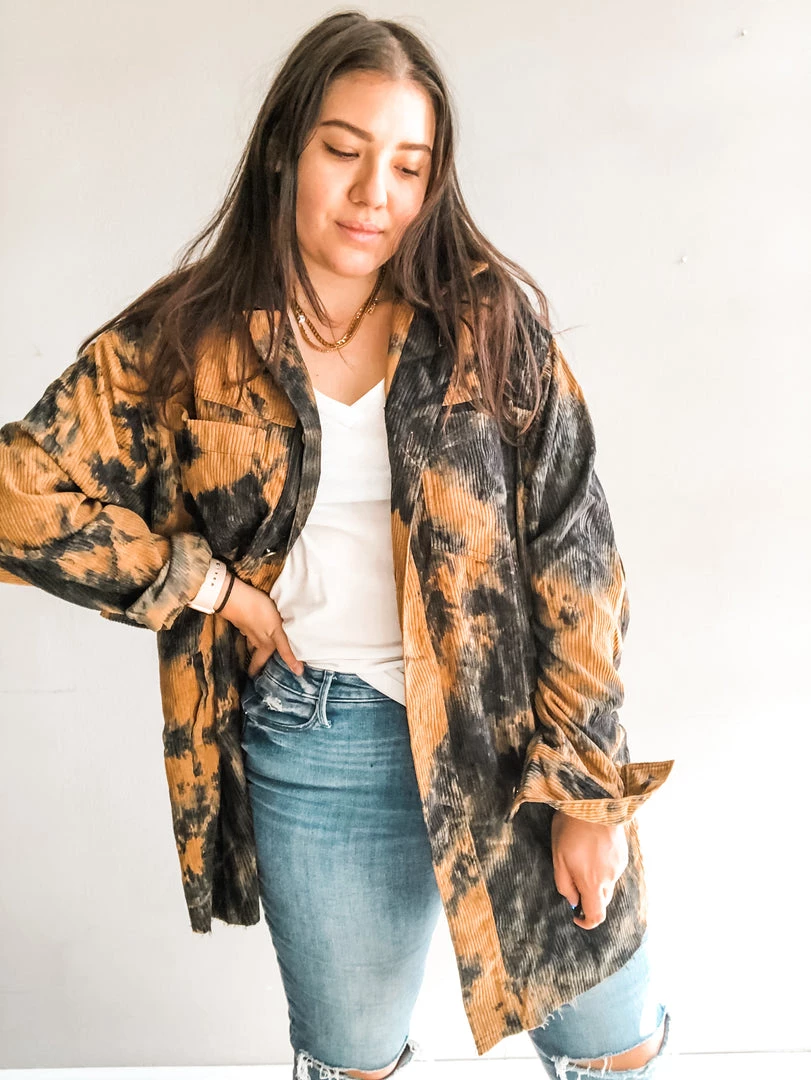 The Wilson cord is an oversized button up that can be worn as a jacket over all your graphics tee or can be rocked alone as a mens-inspired shirtdress!! A tan and black tie dye that feels perfect for Fall. With raw hem, long sleeve and pocket details.