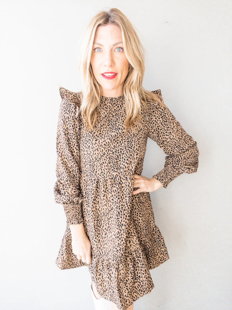 A high neck leopard mini dress with ruffle details that is meant for going somewhere. We love all the details, smocked cuff at the wrist, ruffle detail at the shoulder, tiered skirt and keyhole with button closure at the neck. Pair with booties or sneakers. This dress is versatile and can be worn casual or dressed up. Lined