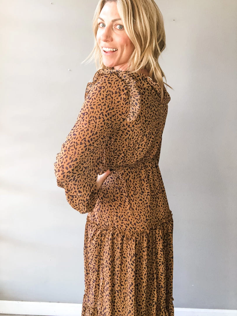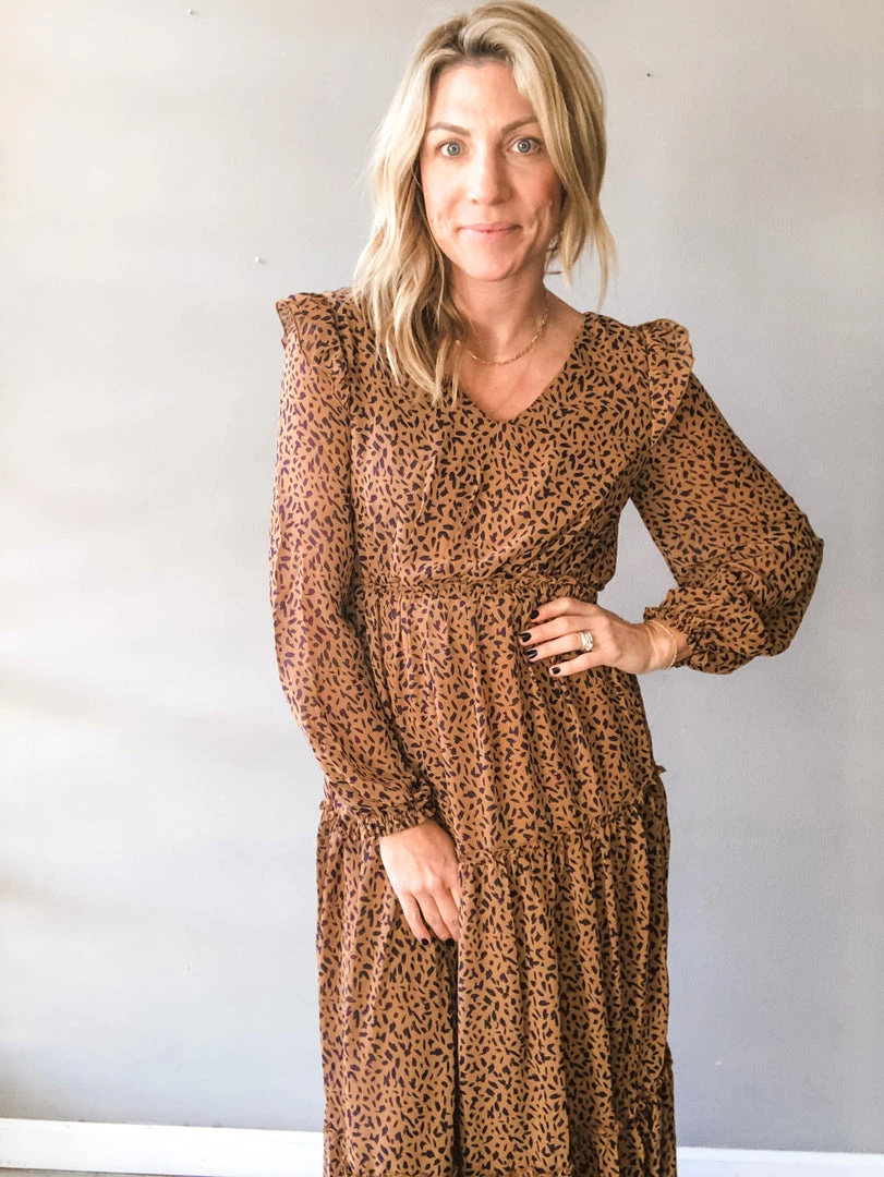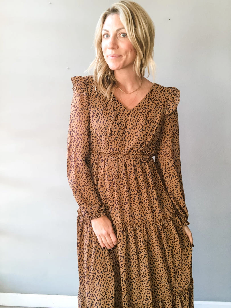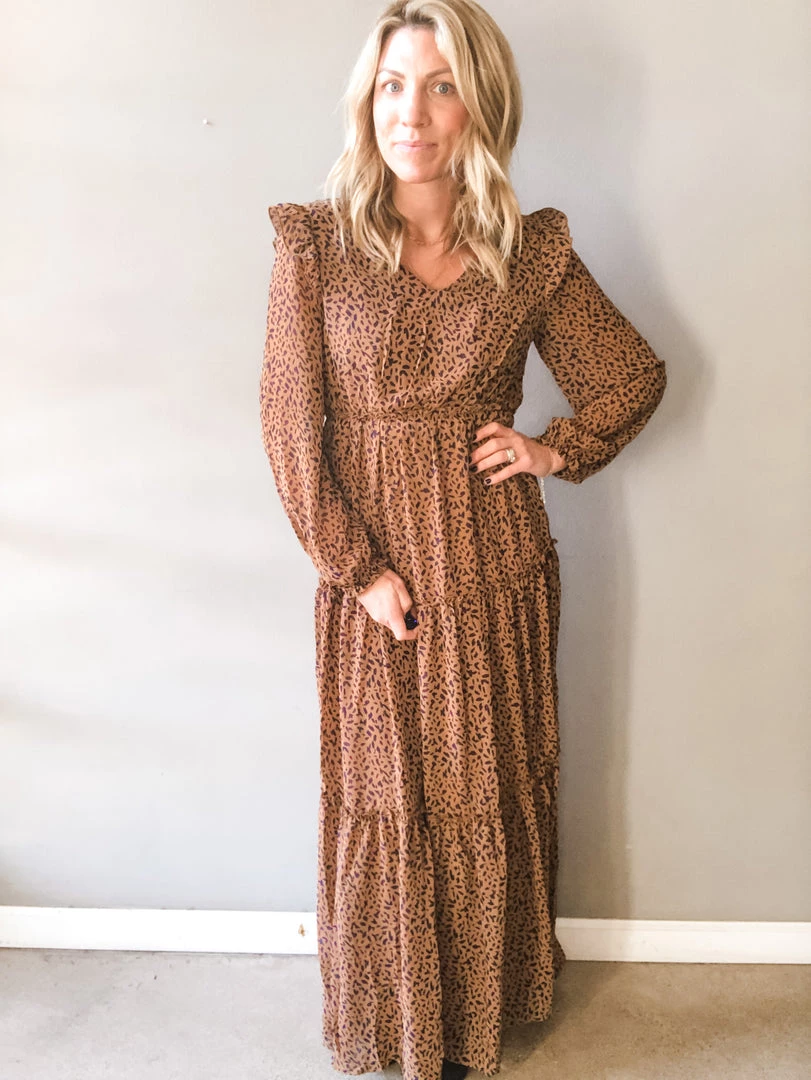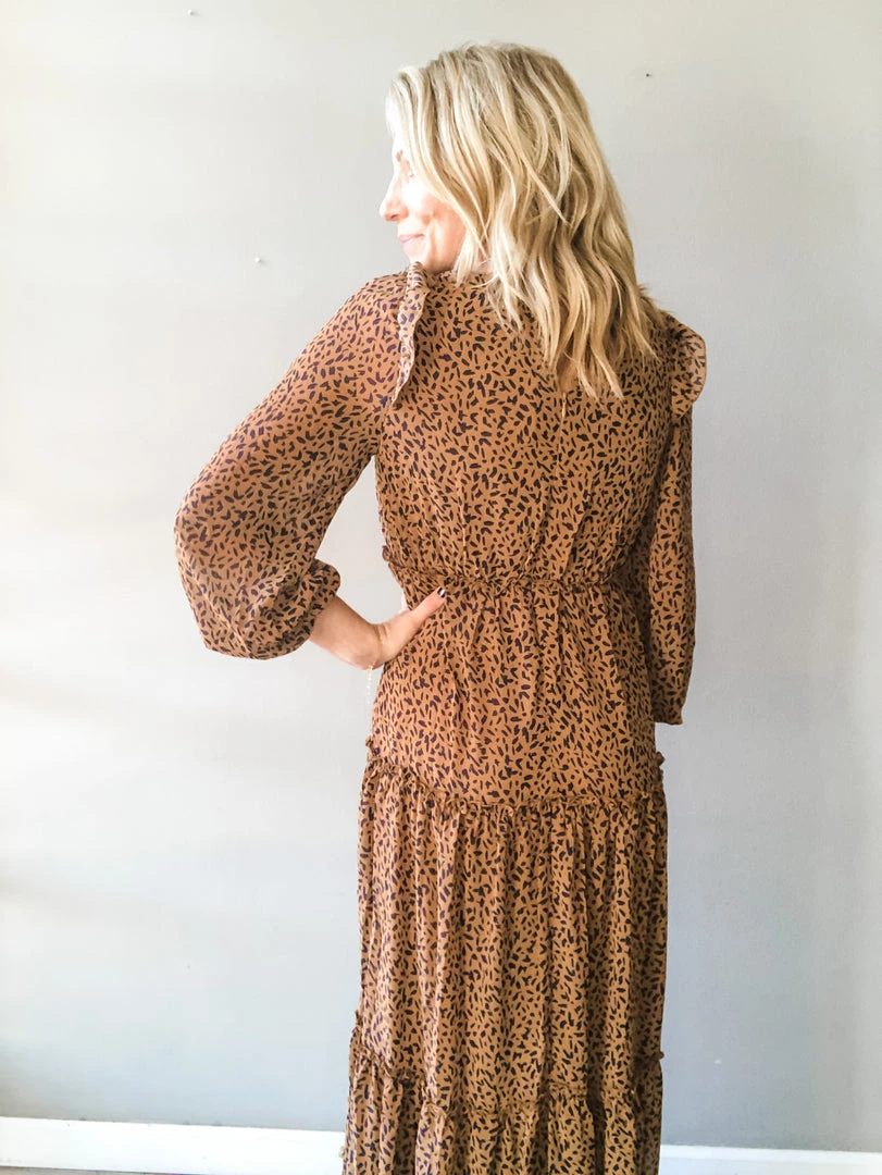 A tiered maxi dress with ruffle details and long loose sleeves. Perfect for fall and any special occasion. Pair with booties for our favorite fall look.