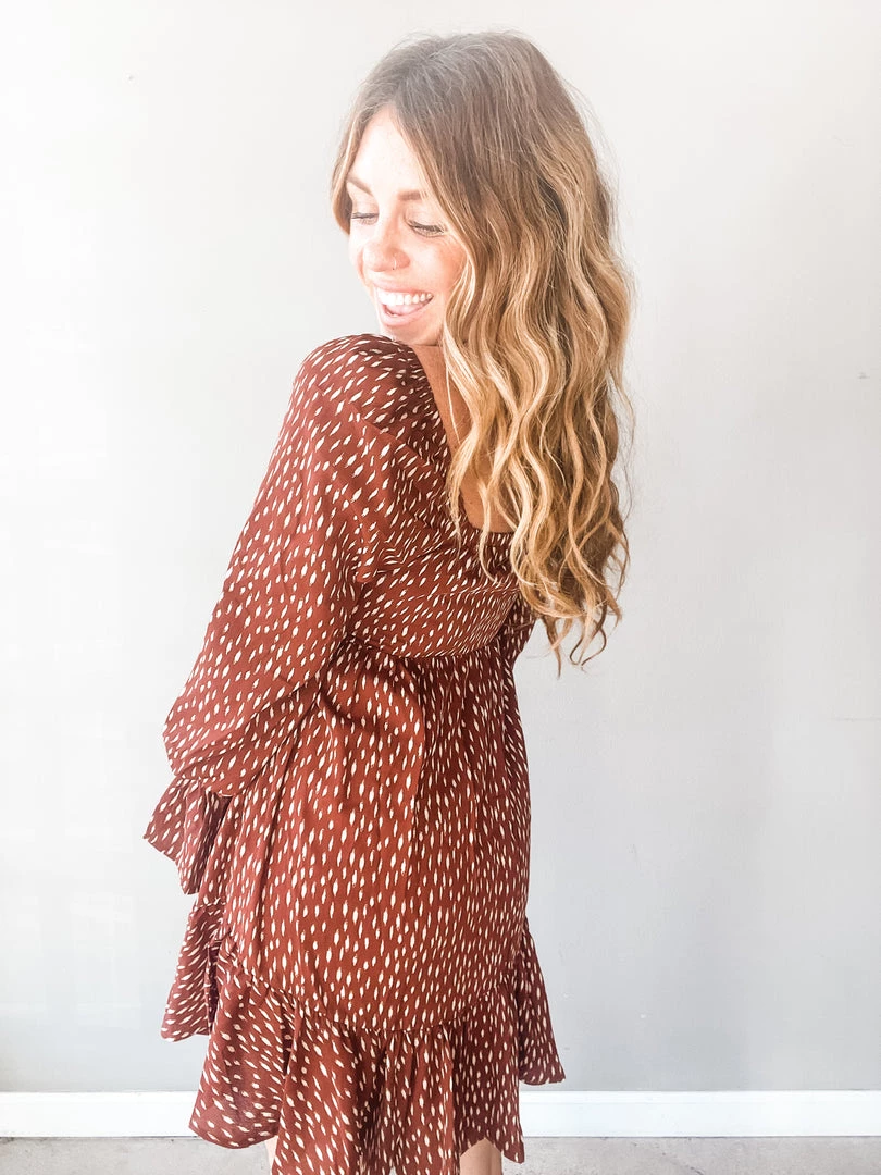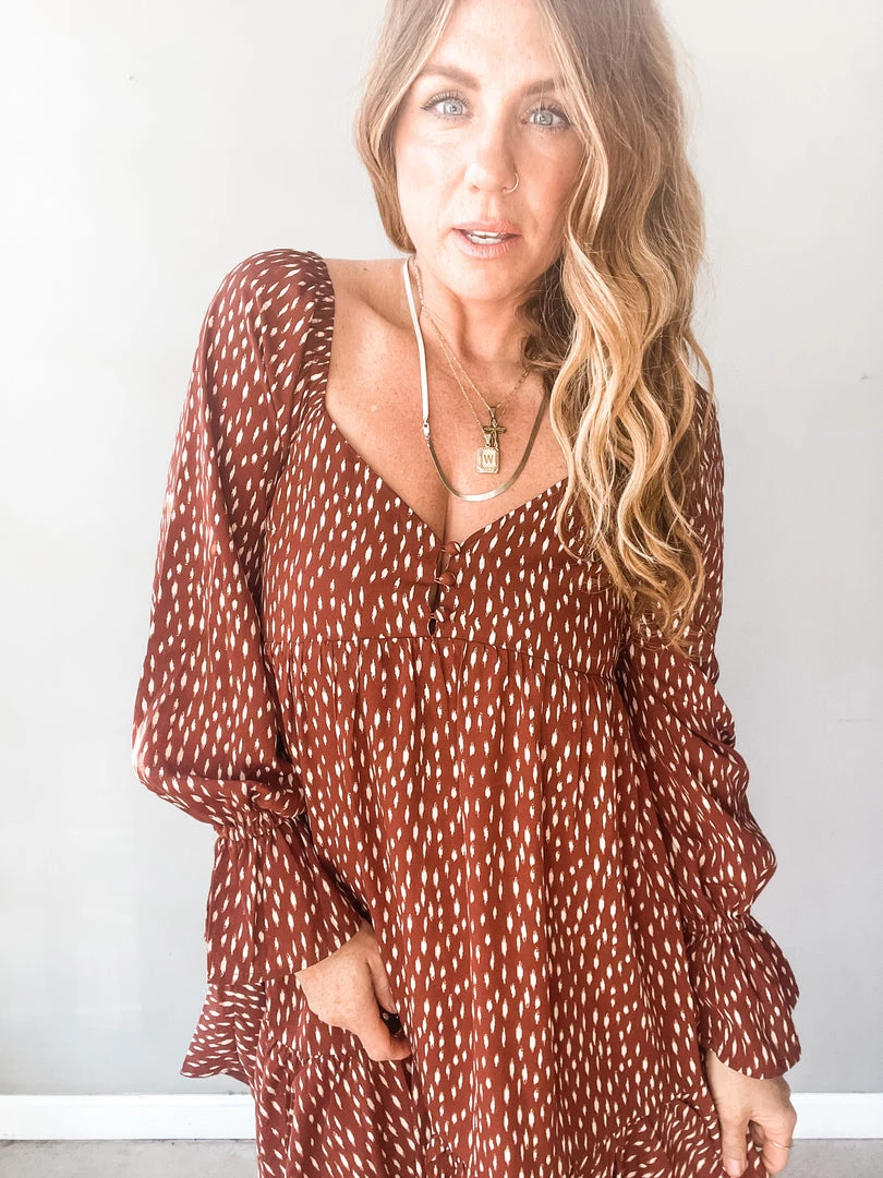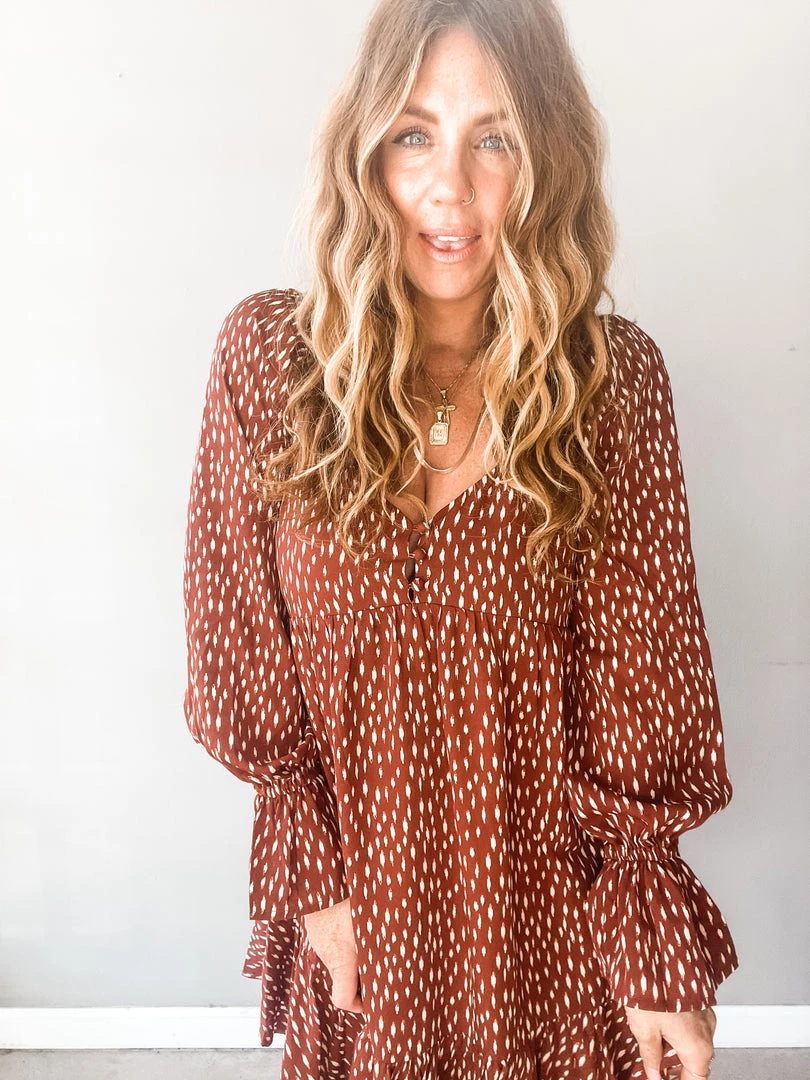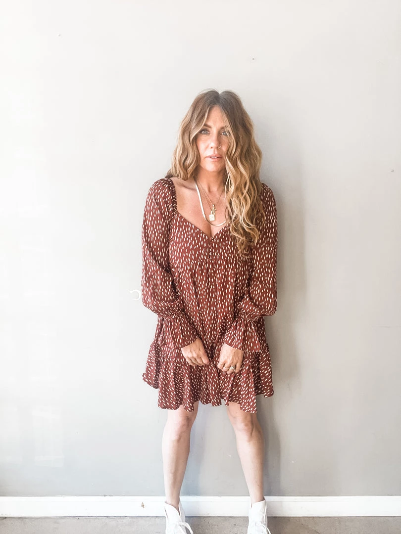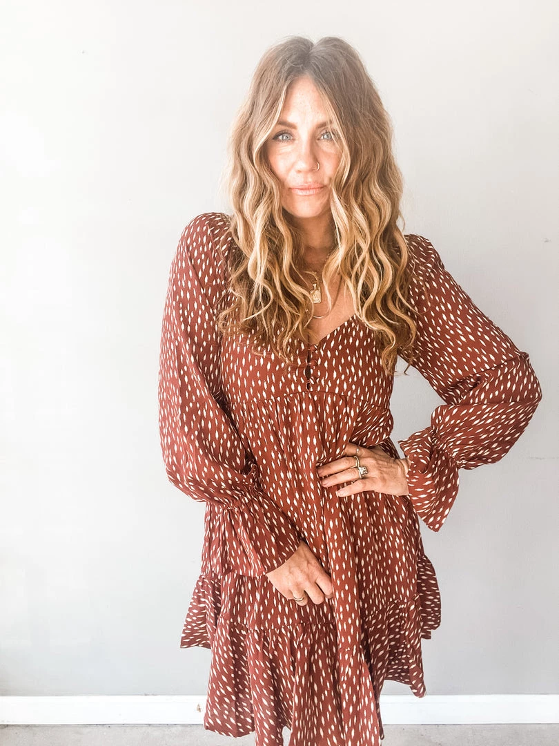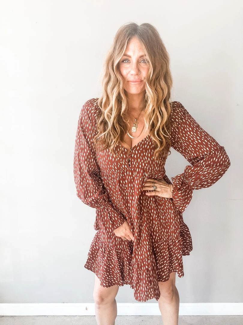 The Seeking Heights Dress is a fun and easy loose fitting mini dress with long sleeves that have elastic hemlines for a fun and feminine fit!!! This dress features three buttons at the bust, elastic neckline (can be worn on or off the shoulders) and a ruffle hem. Love this dress for holiday photos, holiday events, or just because! A great Fall staple, paired with sneakers or dressed up with boots!