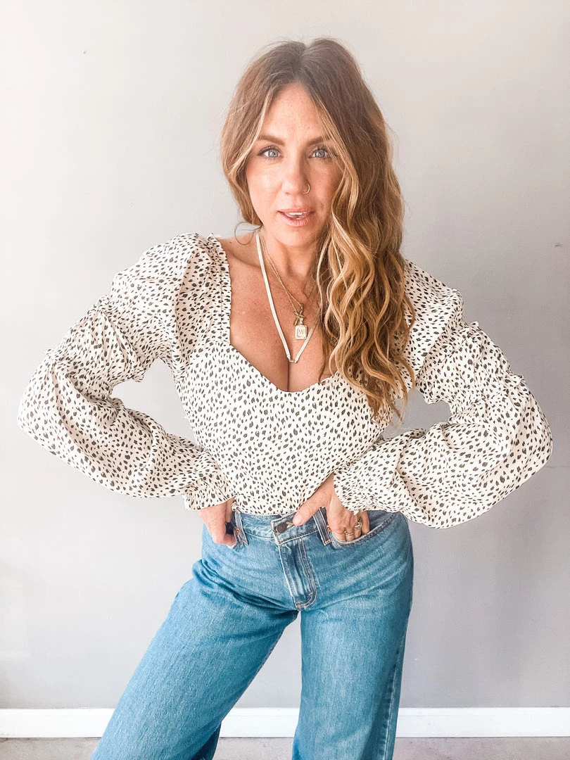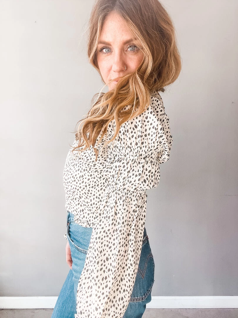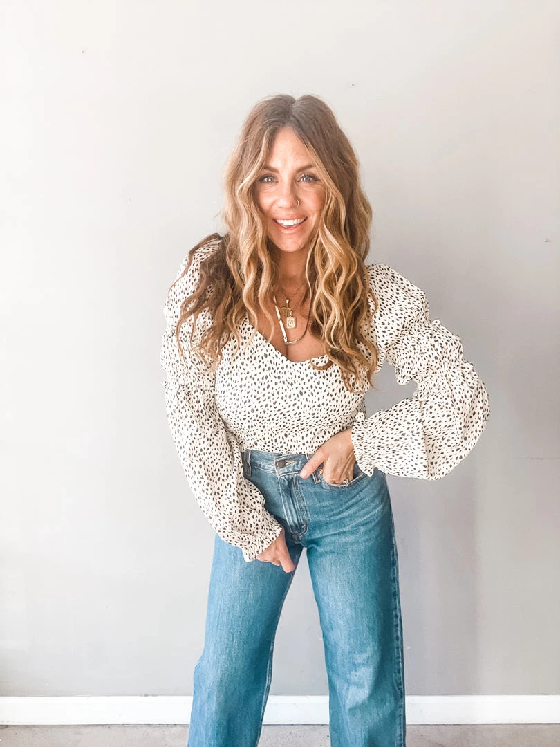 I’m in love with the fit of the She Said Crop Top!!!! A long sleeved crop top with a fun elastic shoulder (can be worn on or off the shoulder) and slight puff sleeve detail. The super flattering cut of this top has a v neckline and smocked back for an easy fit regardless of bust size (and you can go braless which is always a win in our book)! Love it paired with your favorite high rise denim for a casual or dressed up vibe.