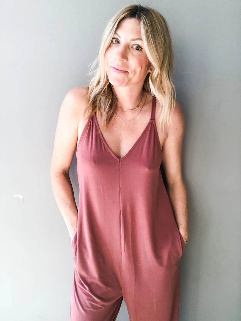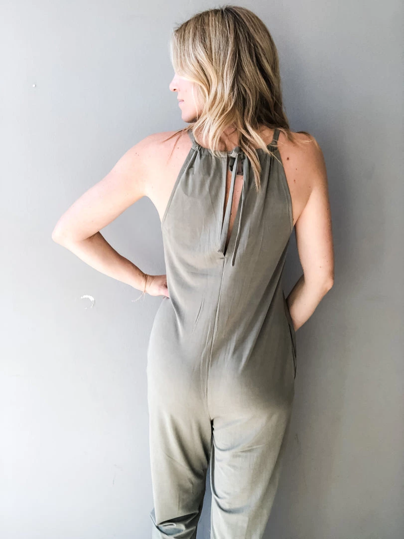 A jumpsuit giving us all those summer vibes. This loose fitting jumpsuit is perfect for lounging around at home or dreamy beachside vacations. It features an adjustable tie and cutout back detill with side pockets, v neck and elastic hem at the ankle. Toss on with fun shoes and hit the town. Versatile and easy to wear.