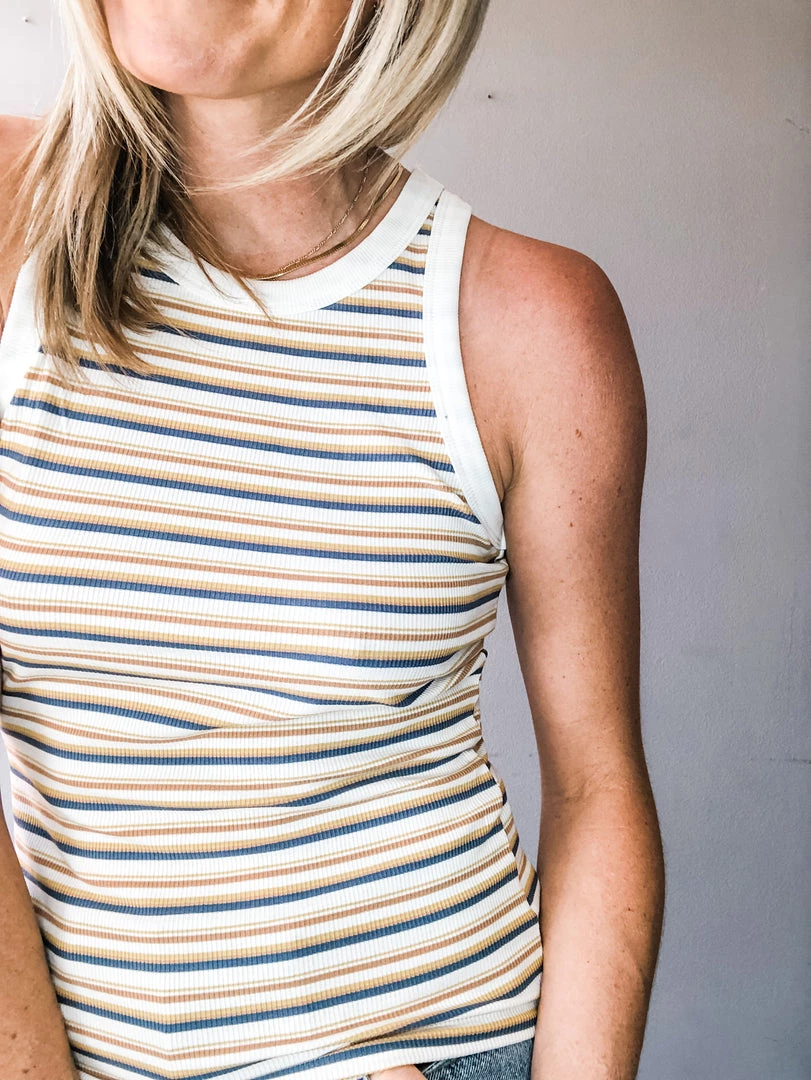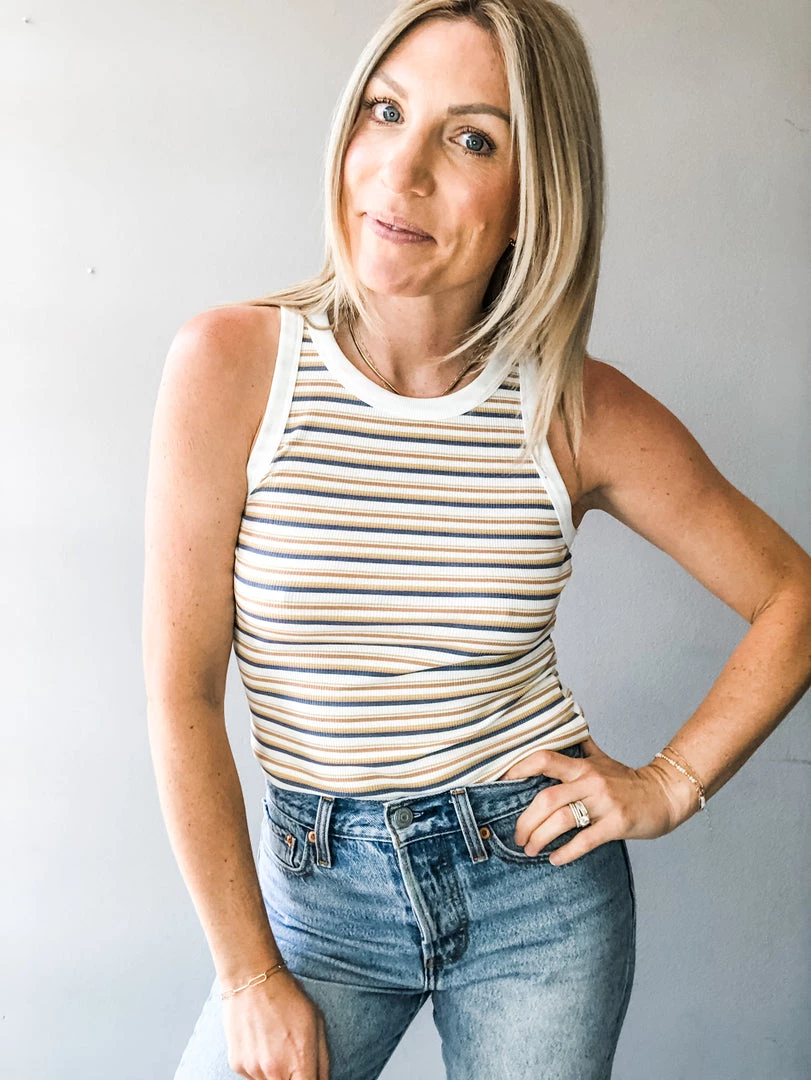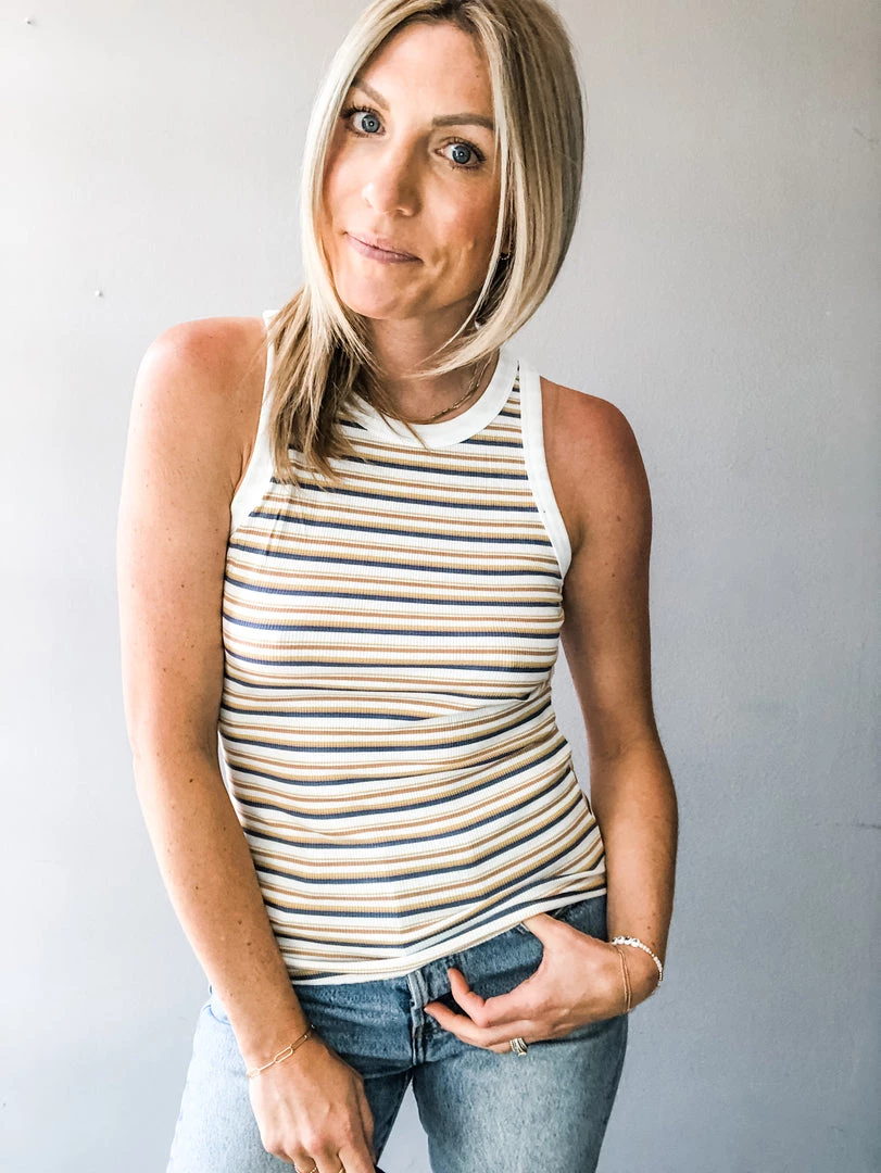 Love the retro vibe to this fun striped tank! A navy and mustard stripe on a white fitted tank with white trim at the neckline and arm holes. Tuck in or wear loose with your go to denim. The perfect staple all year round!