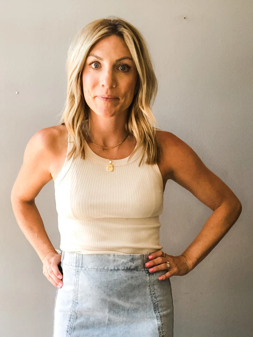 A great basic that you’ll love having in your wardrobe. A natural colorway fitted tank with solid contrast trim at neckline and arm holes. This sleeveless number has a higher round neck that makes for a really flattering fit on every gal. Wear it loose or tuck into your favorite denim.