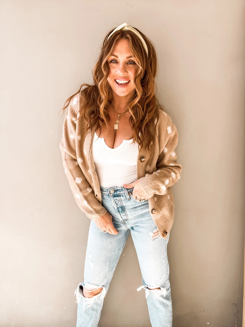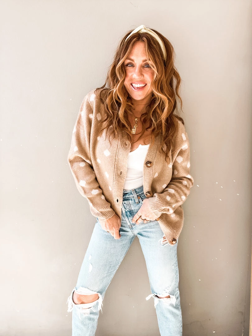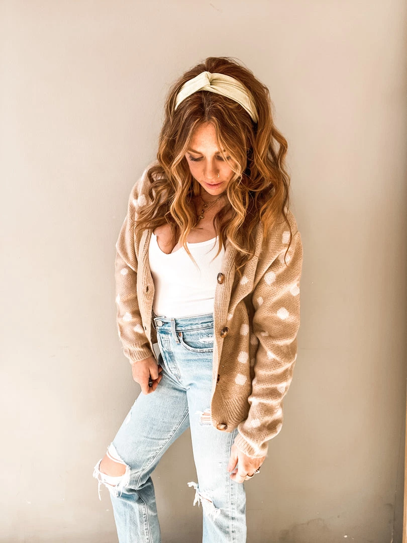 The Doe Cardigan is a sweet and neutral brushed polka dot cardi that makes for a perfect layering piece!! A natural button front with V neck cut and slightly oversized boxy fit. This sweater has looser long sleeves with banded wrists and waist. Easy to toss on over a pretty little cami or bodysuit for date night or paired with a graphic tee for an easy weekend look.