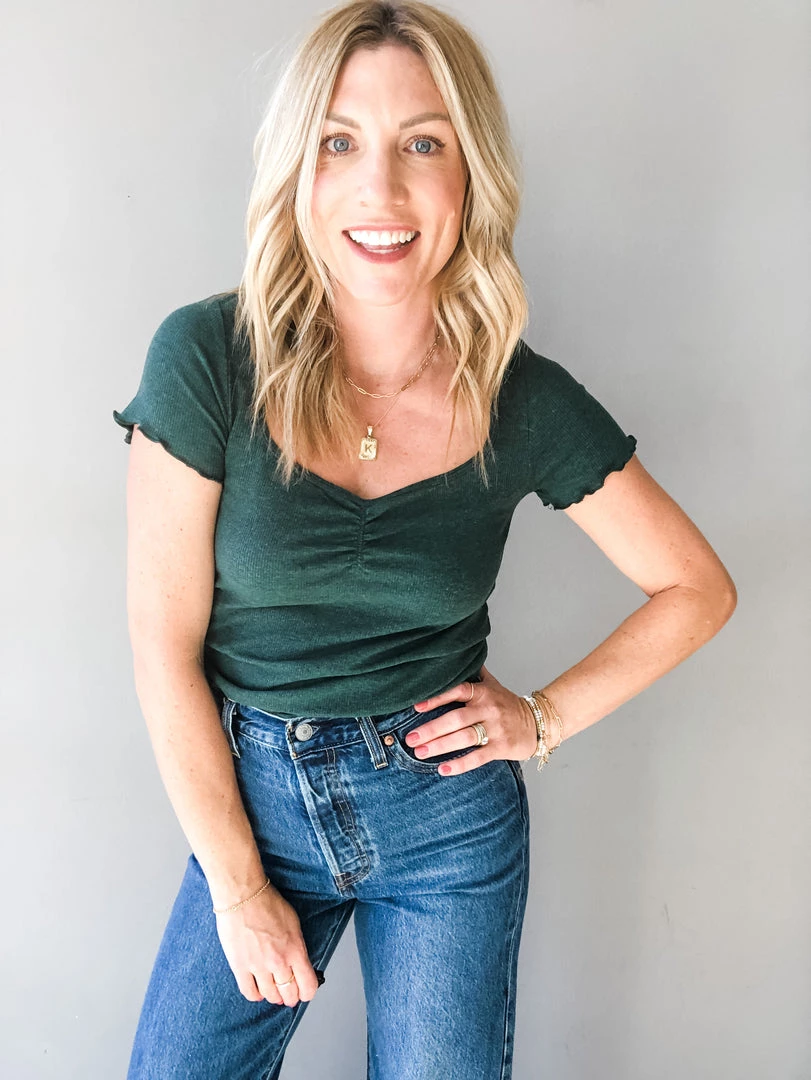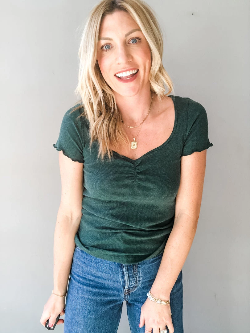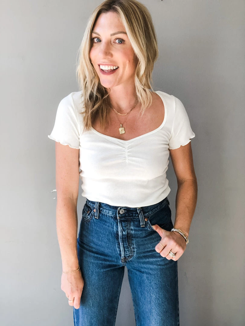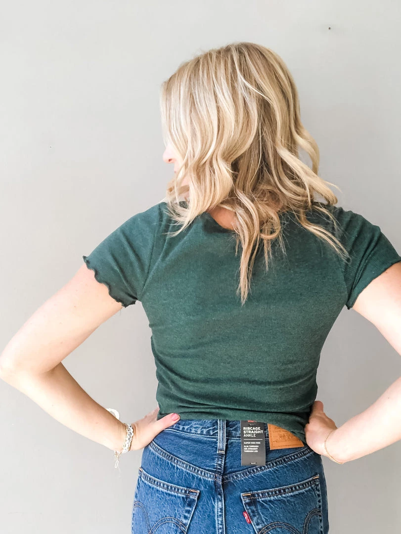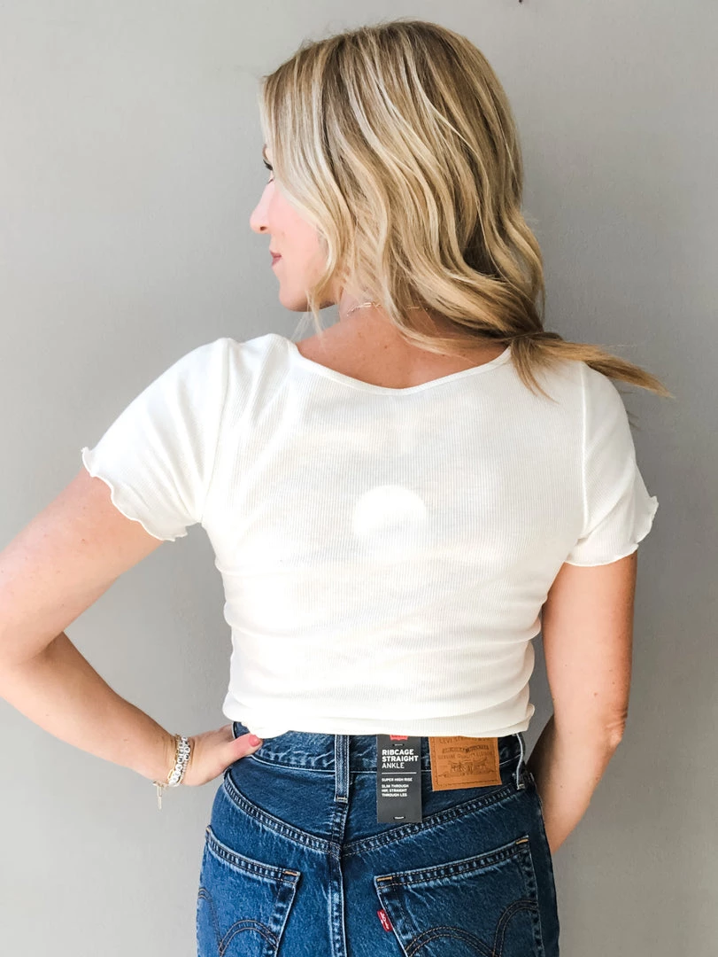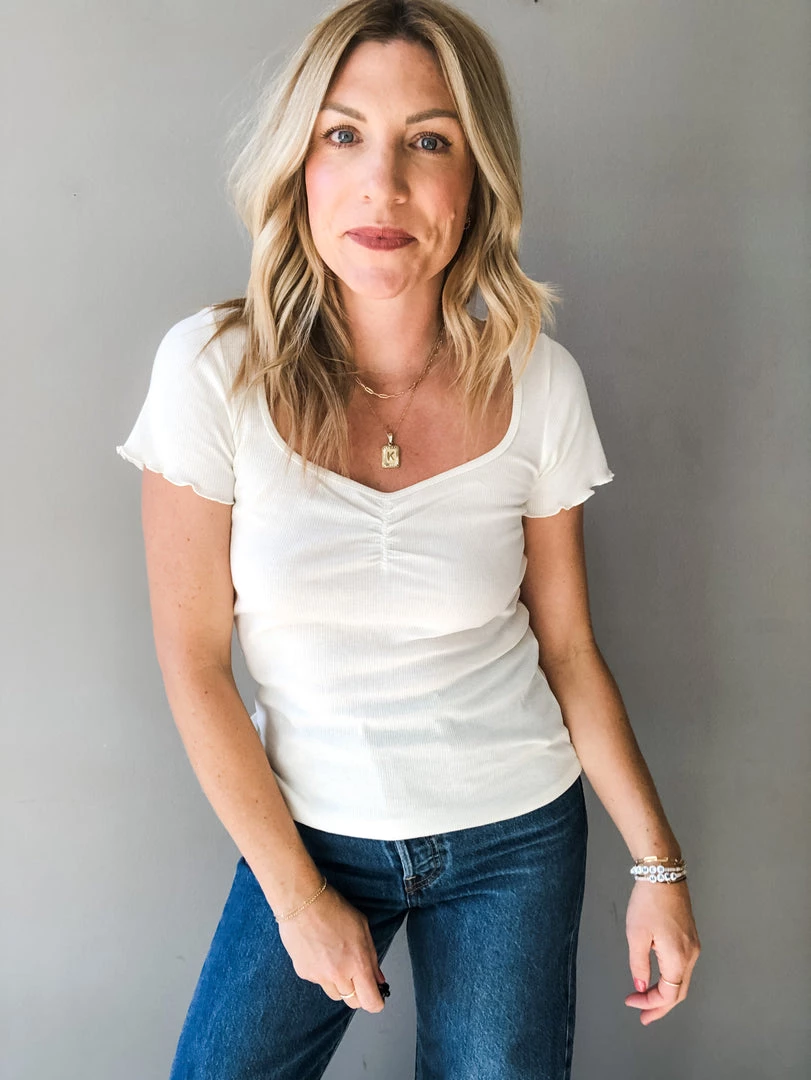 A cinch front ribbed top with a round neck and short sleeve with hem detail. An easy top for everyday wear. Toss on with jeans and sneakers for a casual look or pair with a midi skirt and booties for a dressed up look. Available in two color ways. You probably need both!