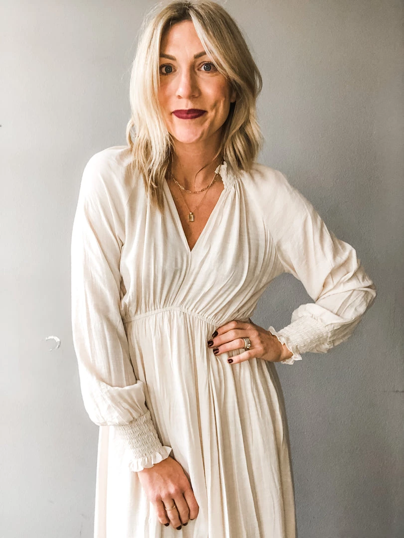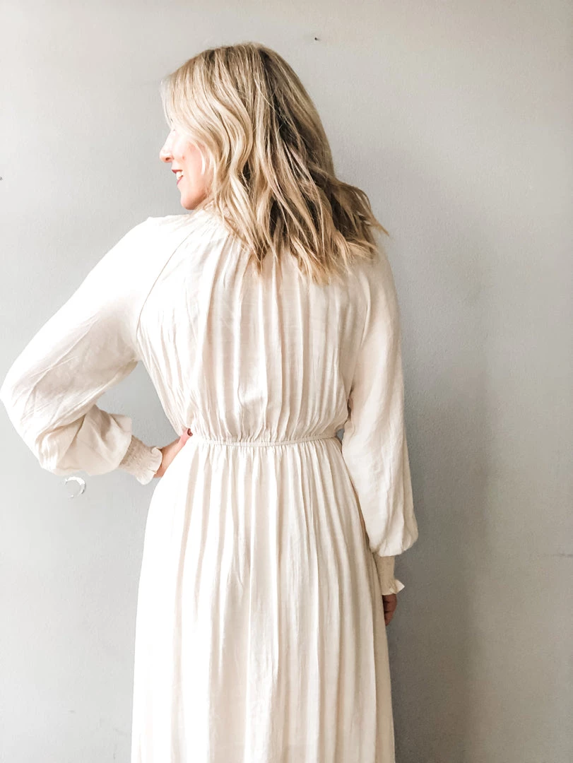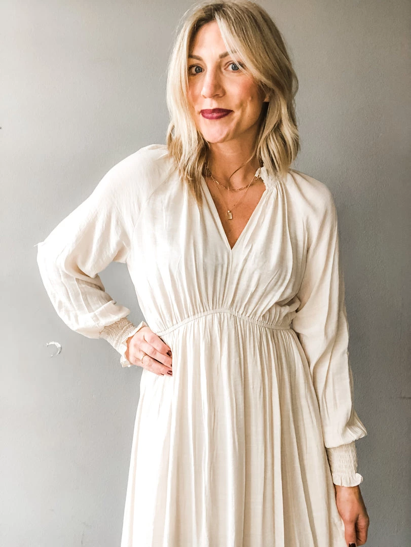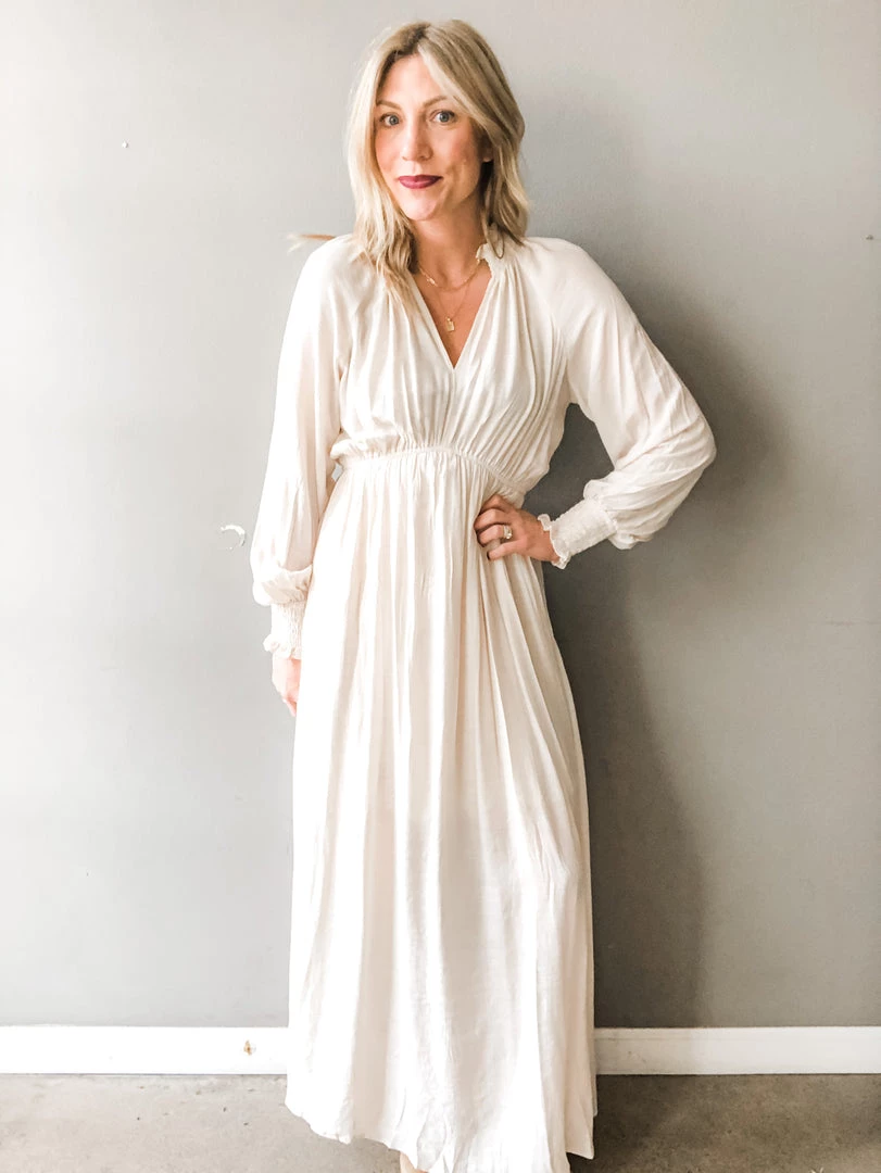 A v neck maxi dress with smocked wrist hem and neckline detail in a simple and chic natural tone that can be worn year round. Dress her up with some layered necklaces and a bold lip for a look we love, whether you are leaving the house or not. Elastic waist and lining throughout.