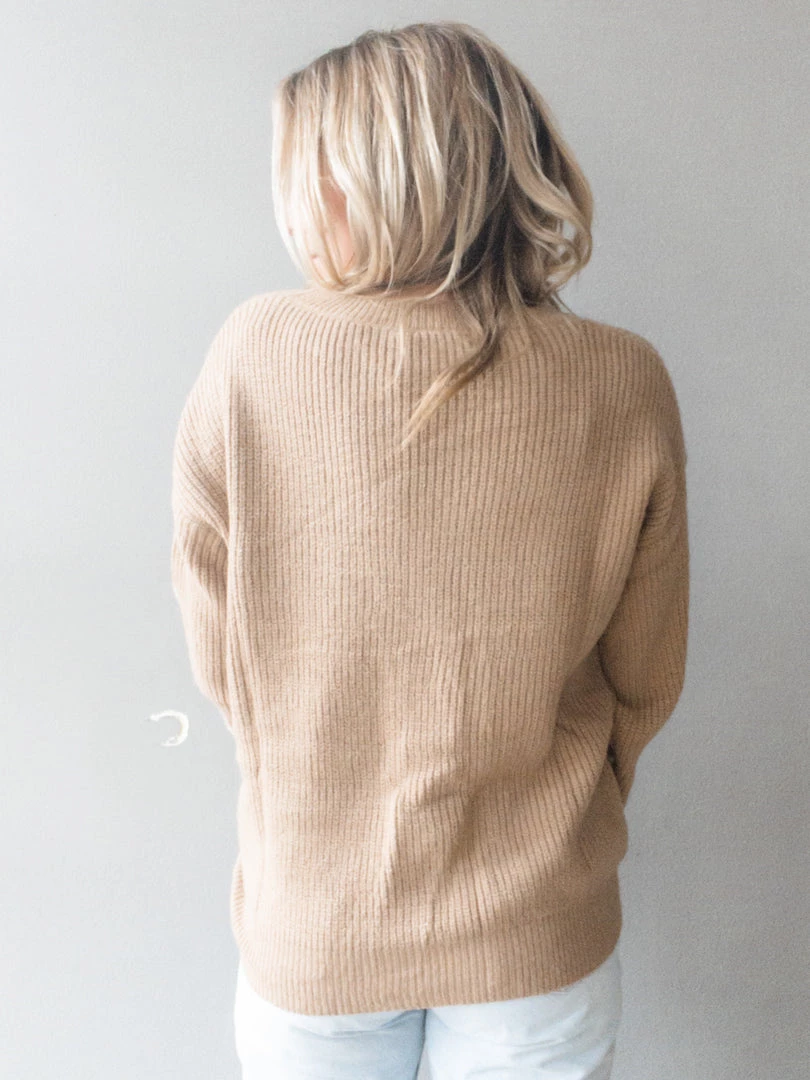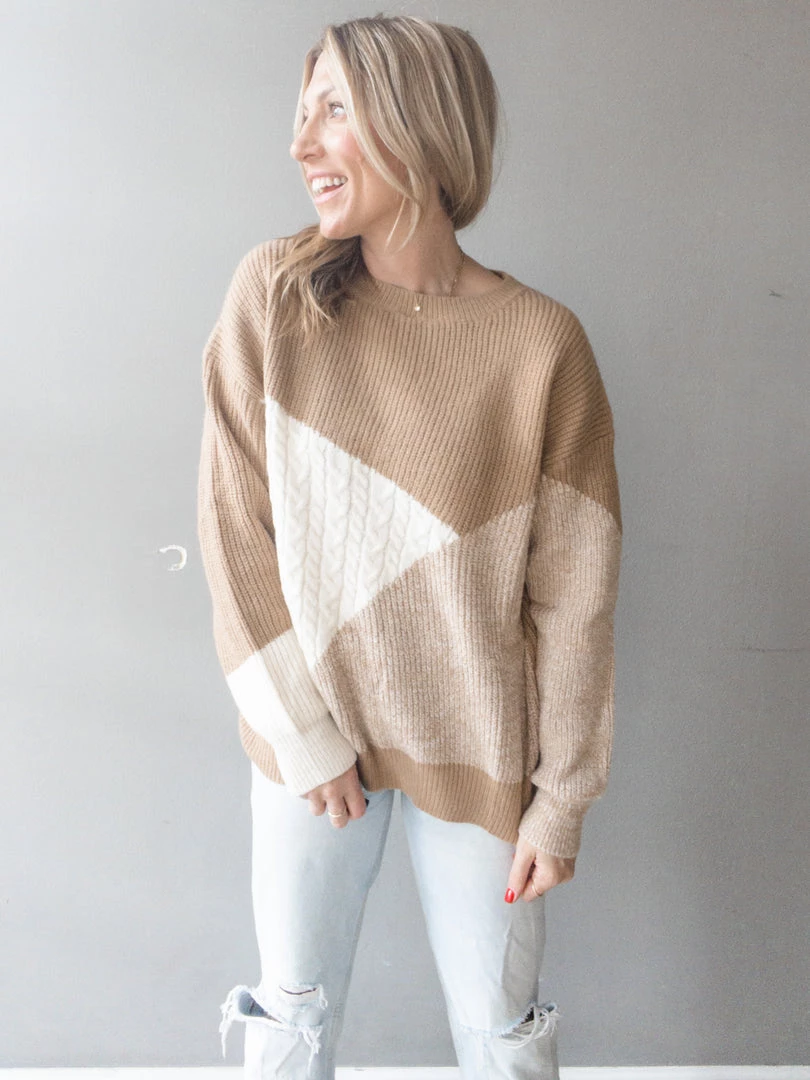 A neutral knit sweater with contrasting color blocking along the front panel and sleeves. Loose fitting with a crew neck, ribbed neck and hemlines. Easy to wear with jeans and booties.