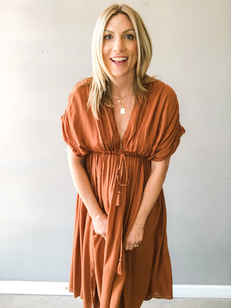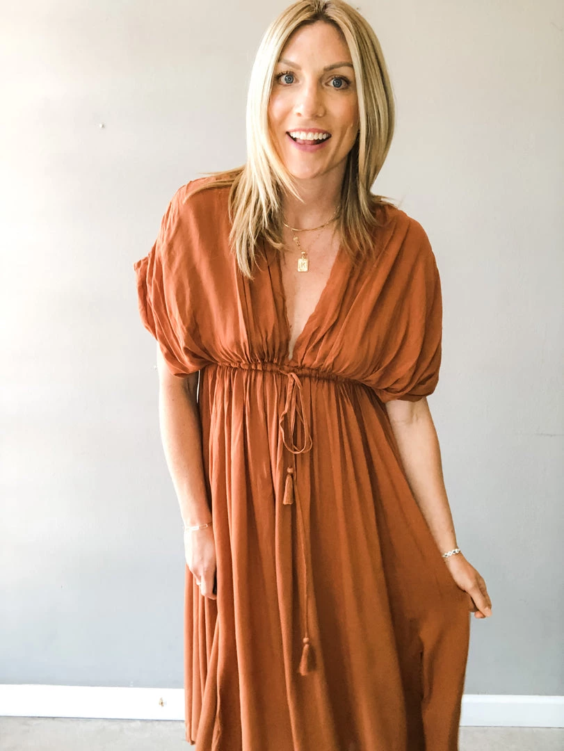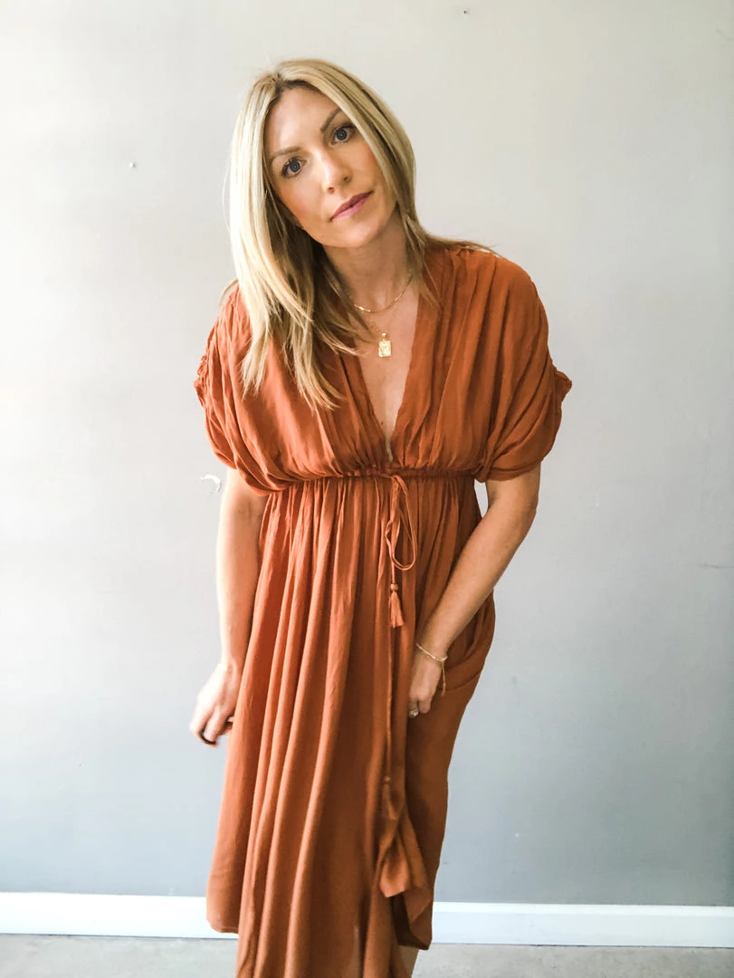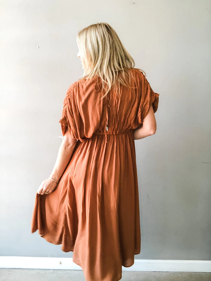 Such a great year round dress. This rust color is always a favorite and is available in a shirring dolman sleeve midi dress with a plunging v-neck and elastic waist with tie. An easy dress to pair and wear for any occasion. Flattering on various ages and body types.