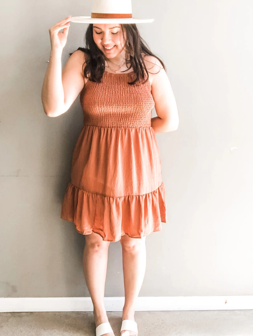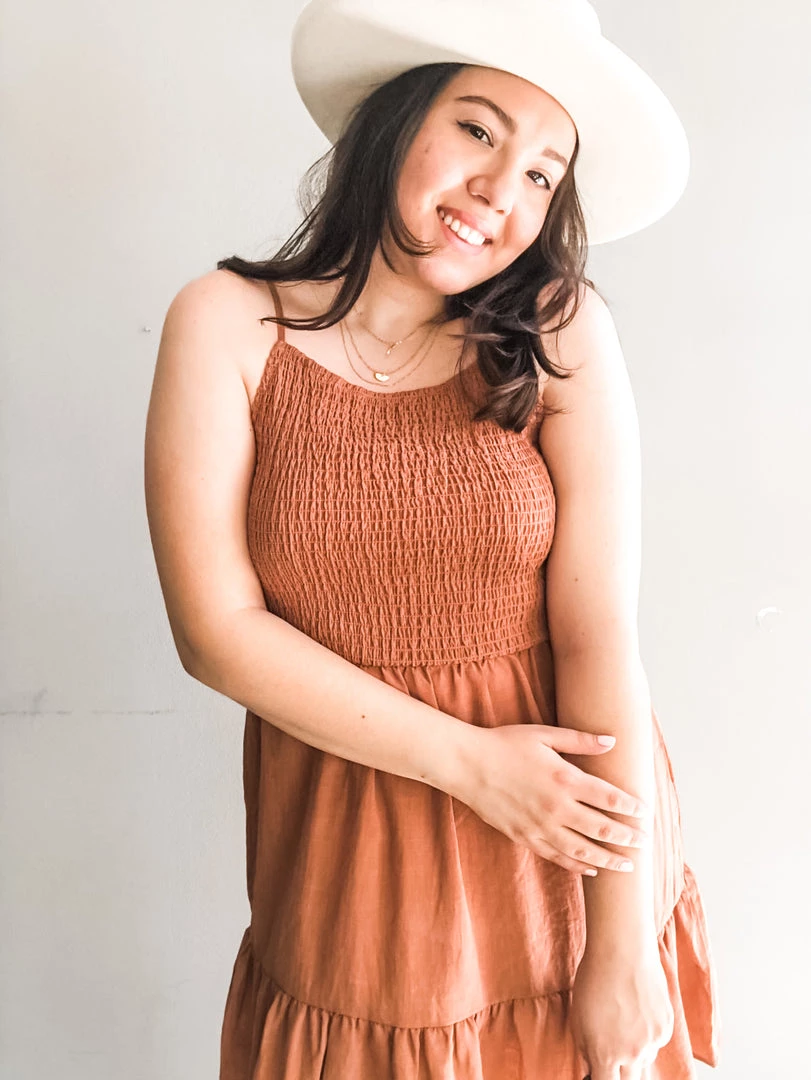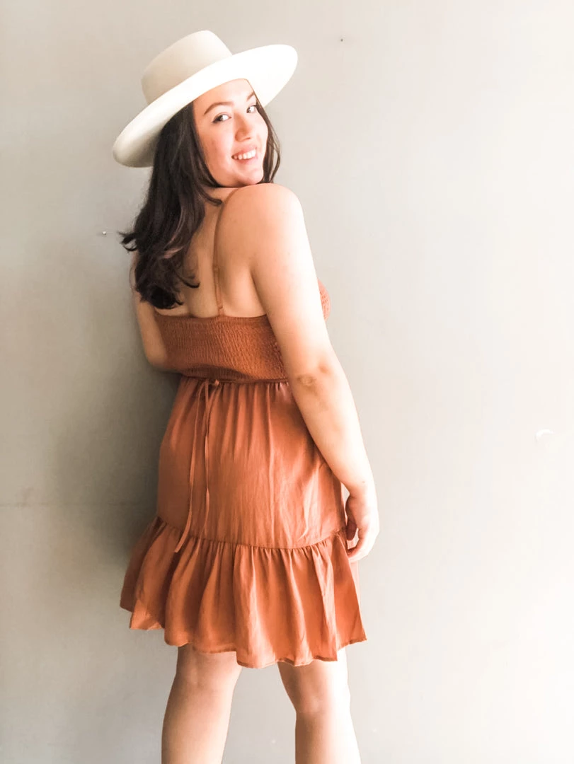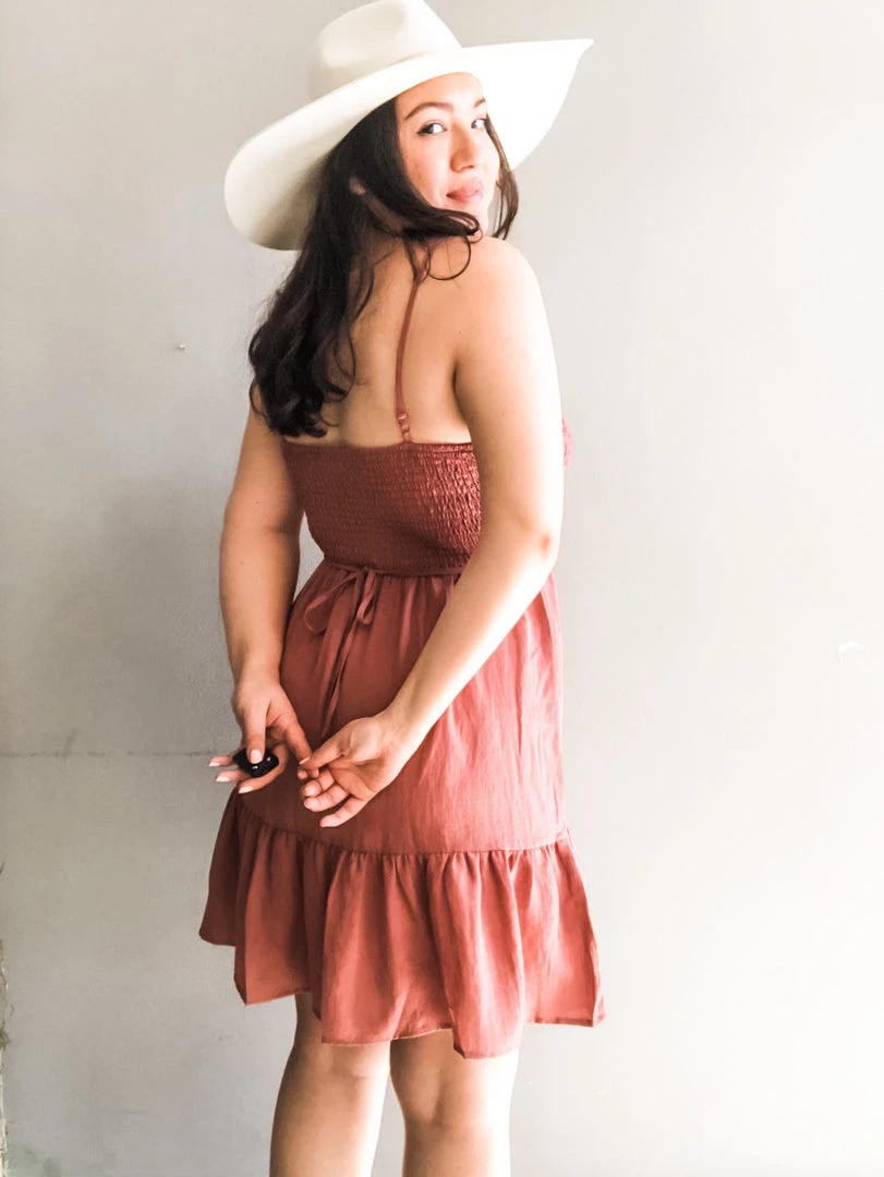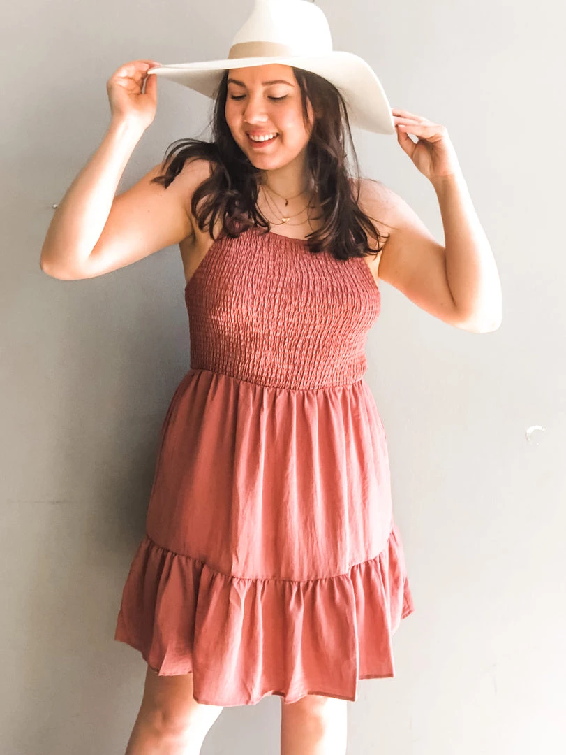 A smocked mini dress in two perfect-for-Spring colorways!! A high neck cut with flowy ruffle hem skirt and tie back. With adjustable straps for an easy fit for all bust sizes. Rock it with a wide brimmed hat and a sandal or pair with our best selling Caty Boots.