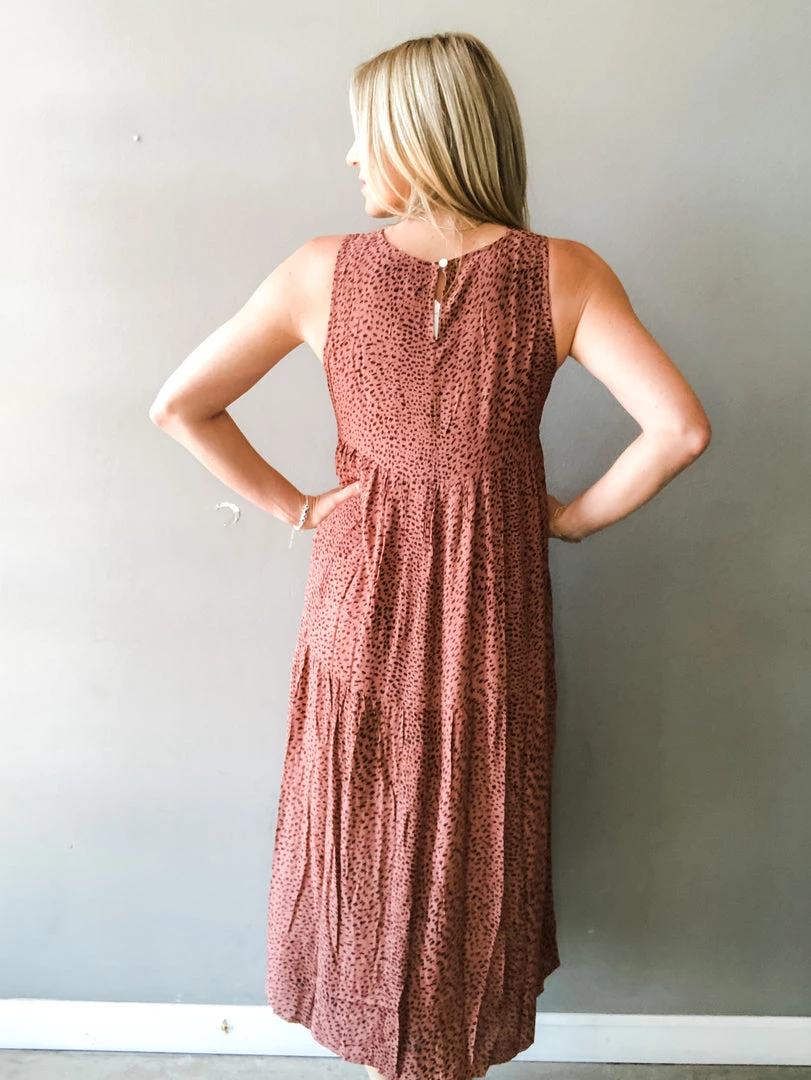 A high neck tiered midi dress that is a great summer staple. Pull on silhouette with button closure at the back, this dress pairs with sneakers for a casual look or can be dressed up for an outing. Available in a ginger color way with black speckles, a great lightweight dress for warm weather ahead.