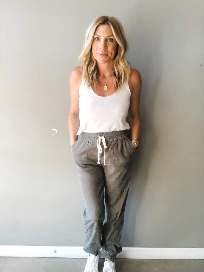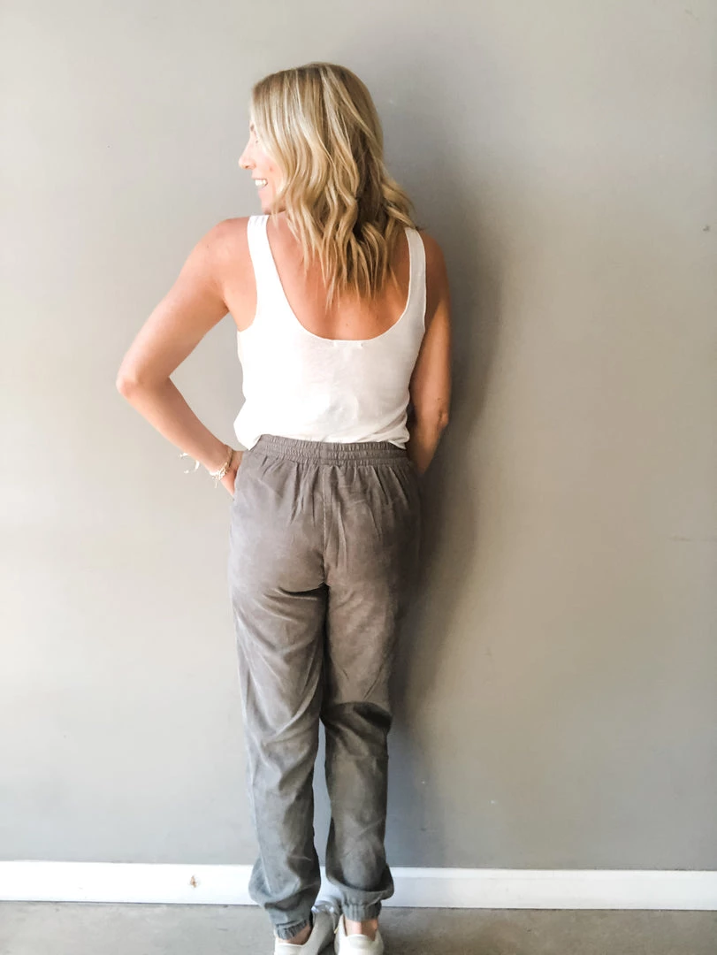 The Malibu Corduroy Joggers are so dreamy. They are a super comfortable light-weight olive jogger with an elastic waist and drawstring, side pockets, and elastic hem at the leg. These guys make it easy to be fashionable and cozy at the same time. Pair with a graphic tee, or a tank and oversized cardigan for ultra comfort.