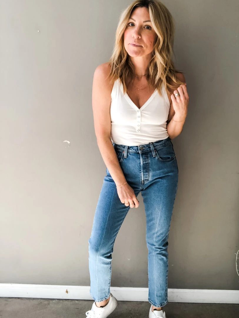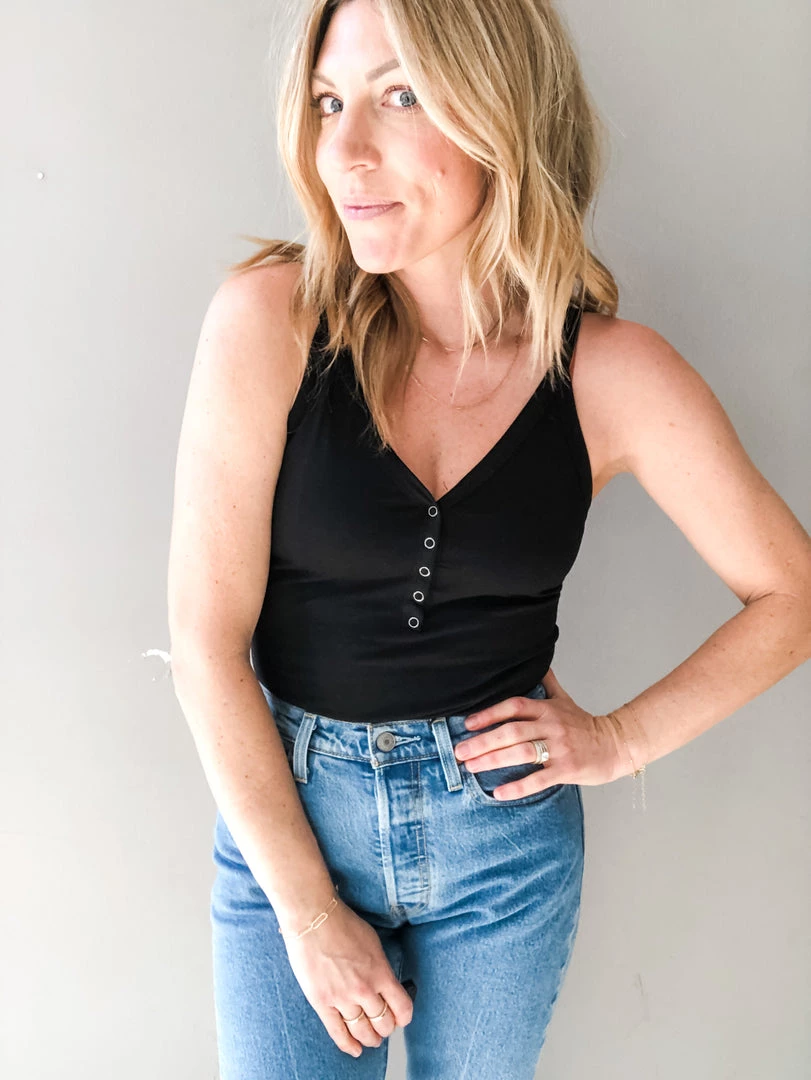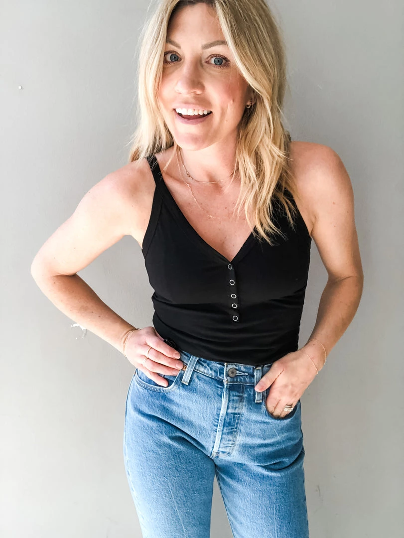 A v neck tank bodysuit is the perfect add to any wardrobe. A henley style tank with snap button front, thin straps and scoop back. A thong style lower with snap button closure, tucks in perfectly with high waisted denim or your fav skirt and can be layered with a sweater or jacket as we head to warmer weather.