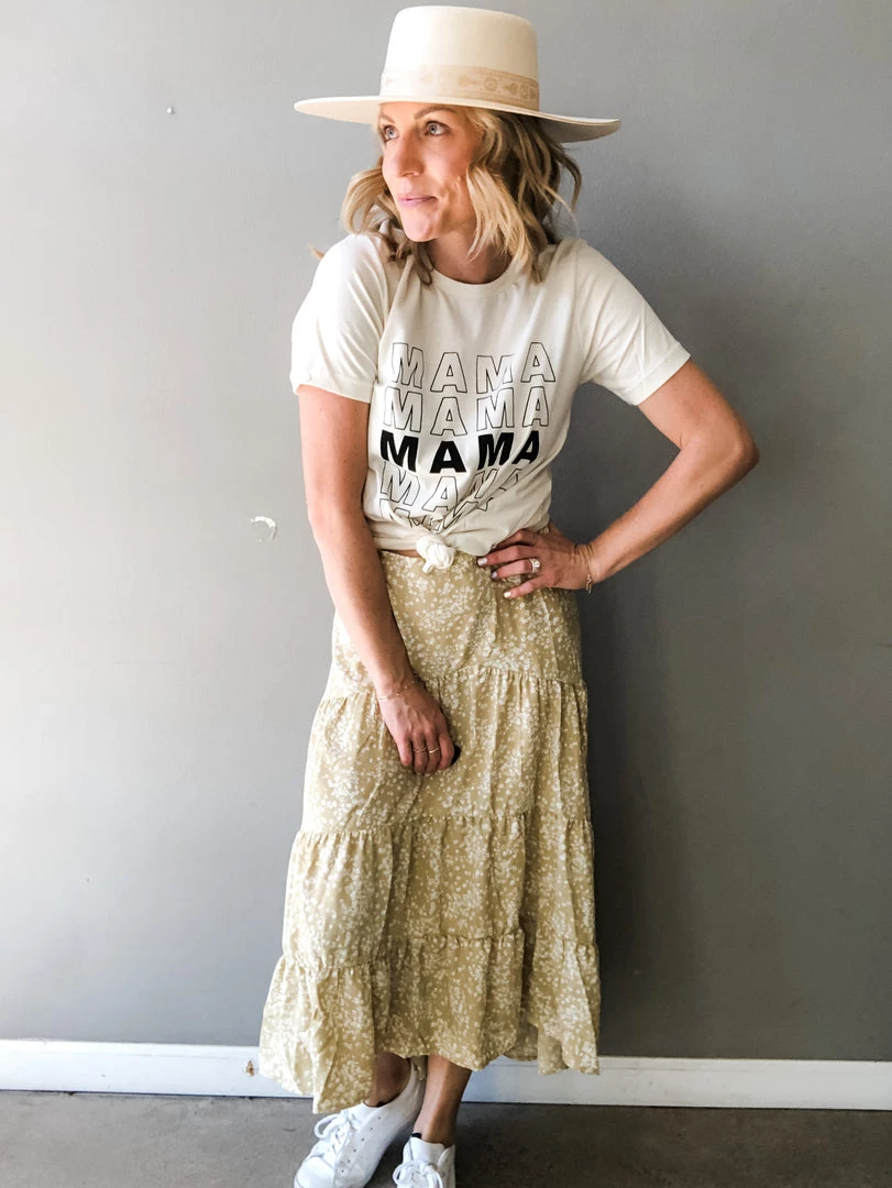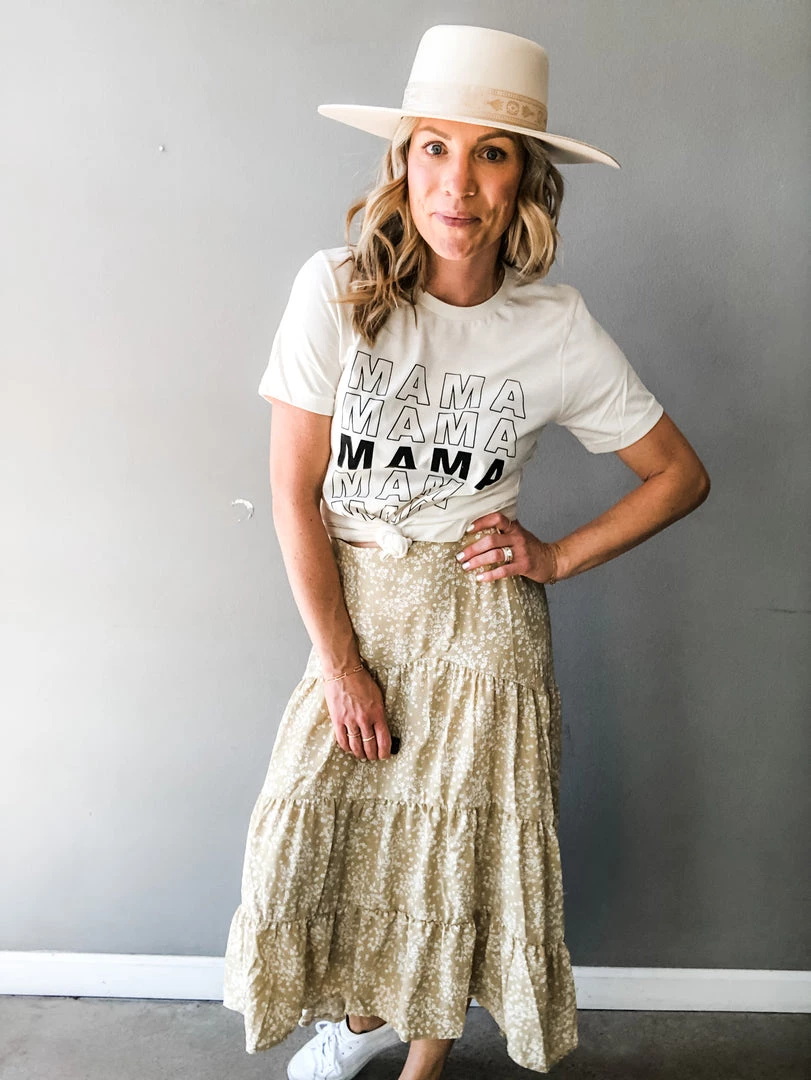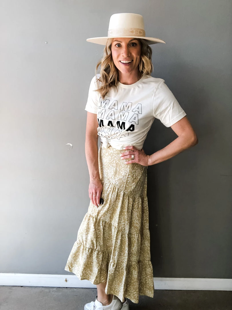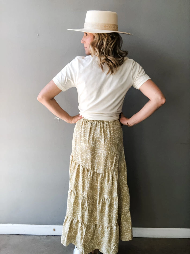 A flowy midi skirt in a great washed floral print! This tiered midi has a fixed front waist with elastic back and side zip close. We love it with sneaks and a graphic tee or dressed up with slides and a sweet cami.