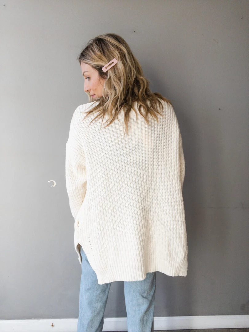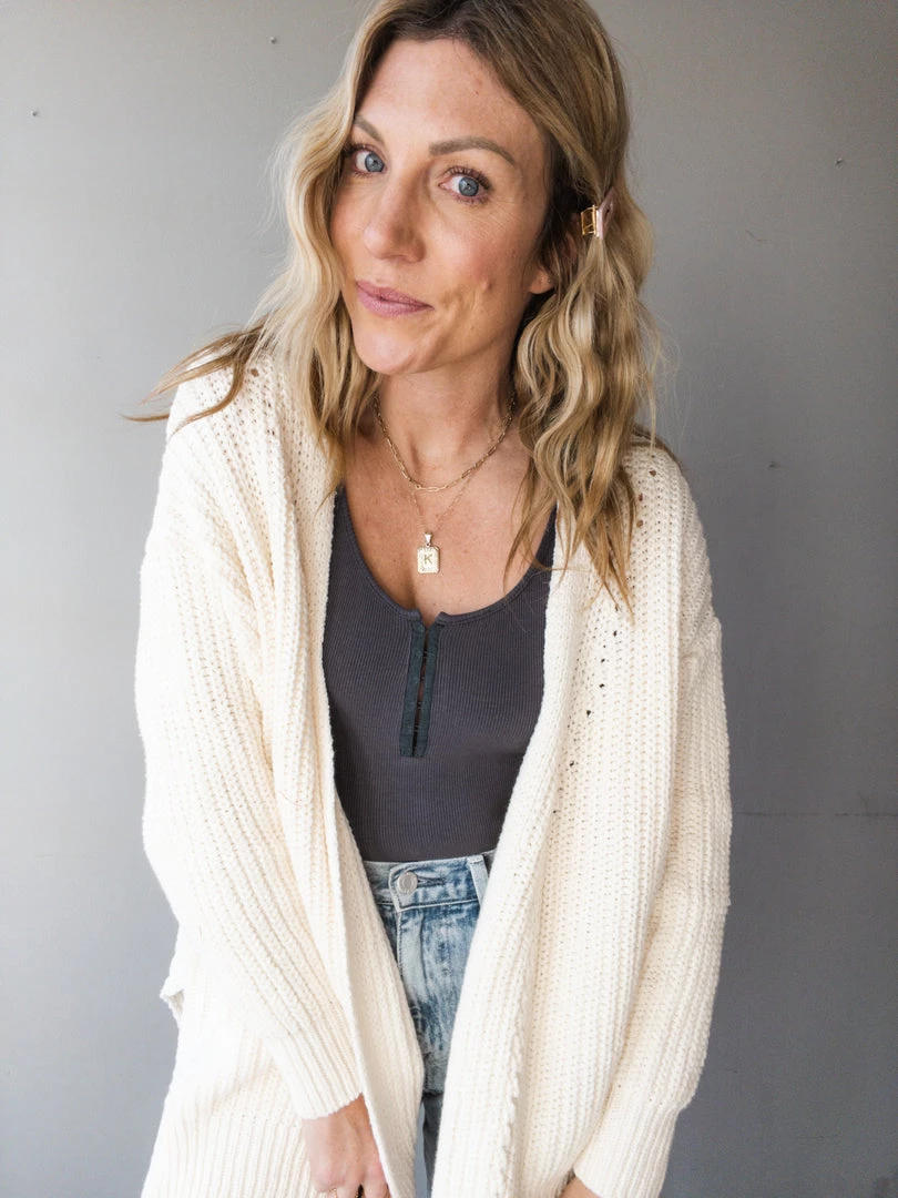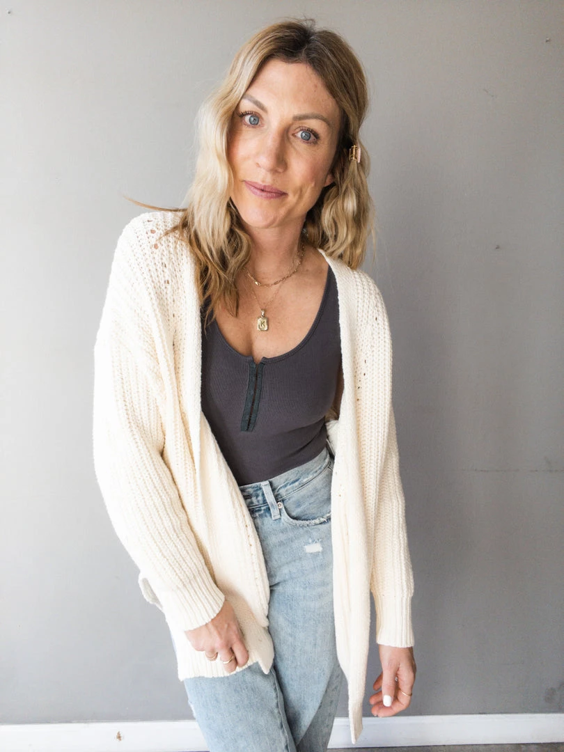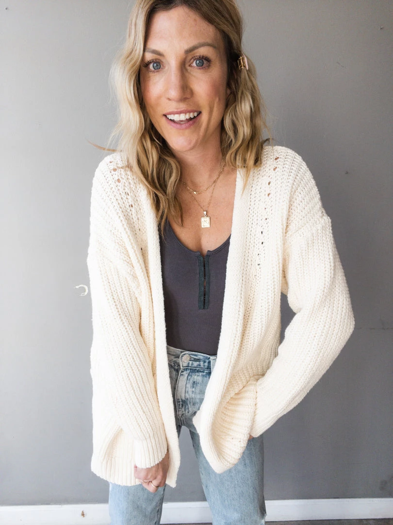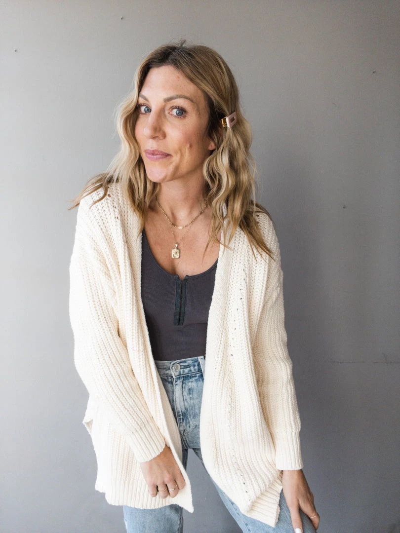 A cozy open knit cardigan that is so chic and comfy!! A fun and exciting staple that features side slits and pockets. The perfect little pop of something special and cozy in a classic neutral. Wear over so many looks, dressed up or down.