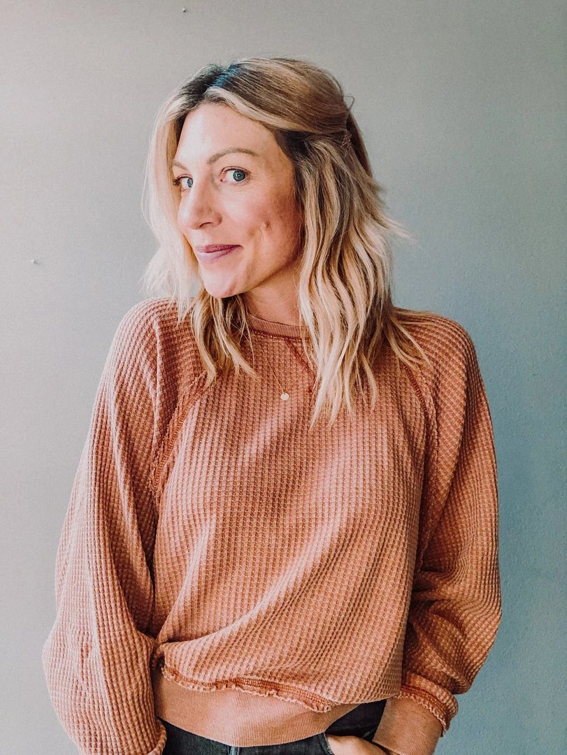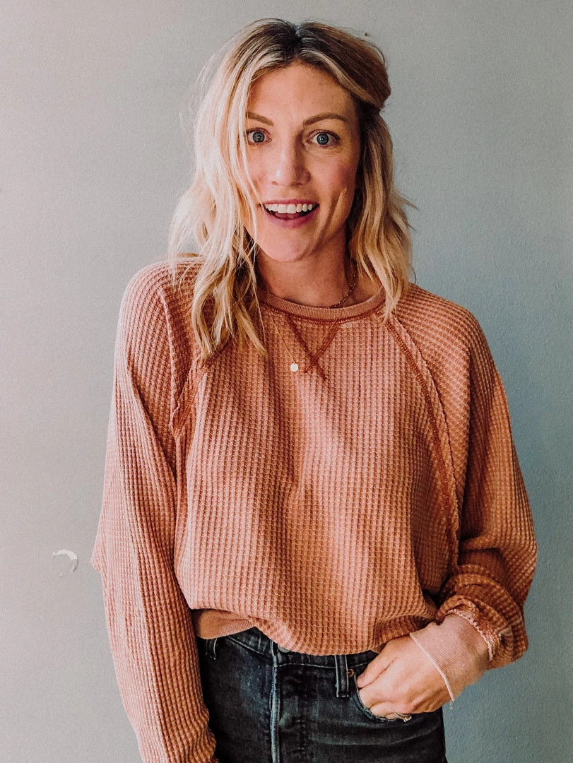 A cropped, crew neck made from a large waffle thermal fabric with a worn in feel. This relaxed fit pullover is perfect for cooler weather paired with denim or for lounging. We love the ribbed and raw edge details giving this long sleeve a more textured look.
