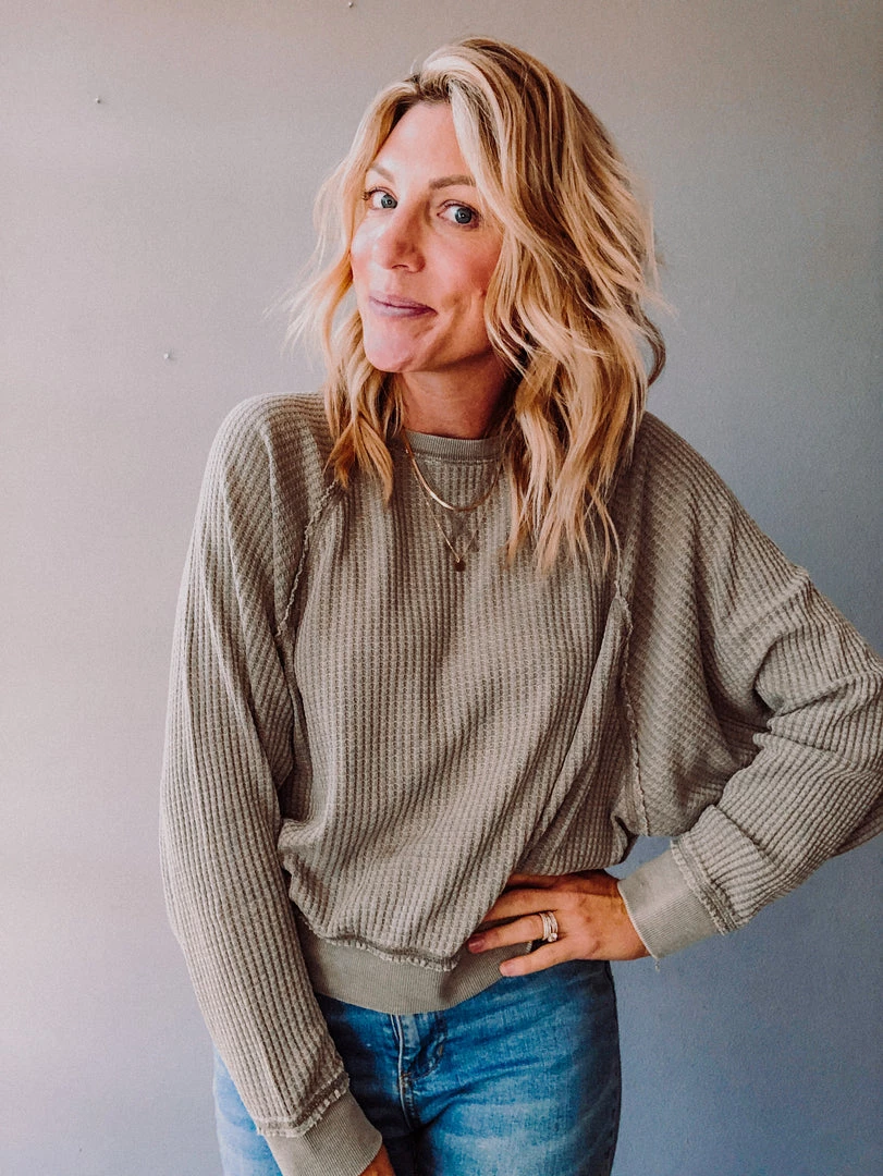 A cropped, crew neck made from a large waffle thermal fabric with a worn in feel. This relaxed fit pullover is perfect for cooler weather paired with denim or for lounging. We love the ribbed and raw edge details giving this long sleeve a more textured look.