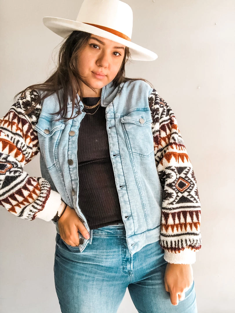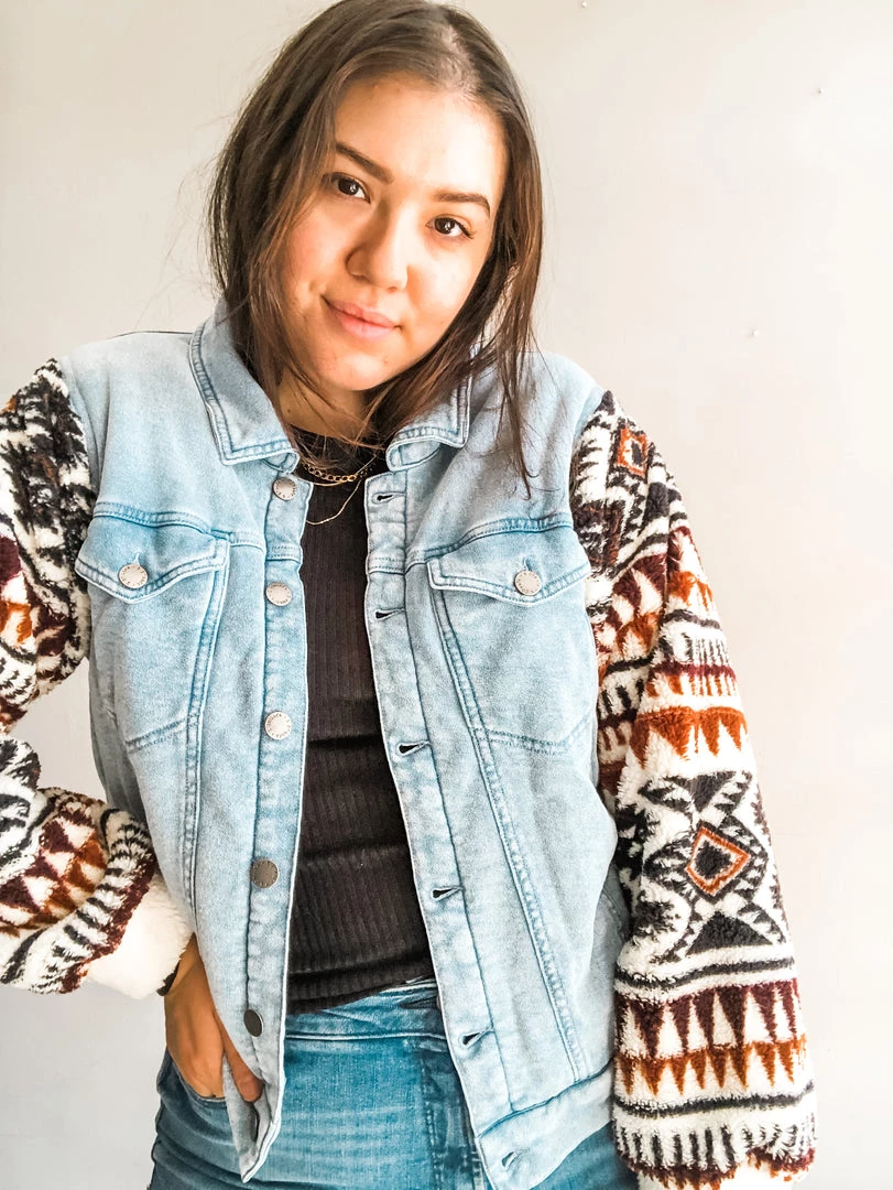 Be still our denim loving hearts!!nThe Gia Knit Denim Jacket is a knit denim and french terry fabric. The classic silhouette of a denim jacket now with contrasting brushed printed sleeves. An oh-so-plush sherpa lining will give you all the cozy feels. Relaxed fit throughout.