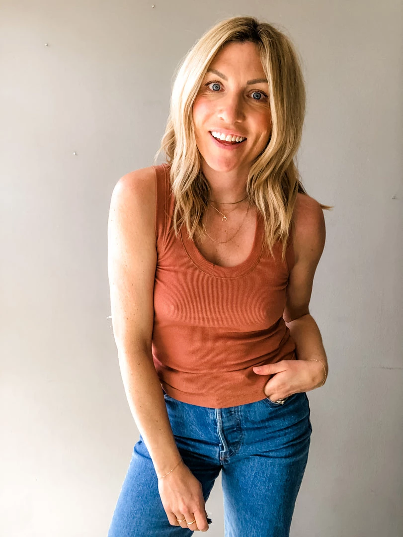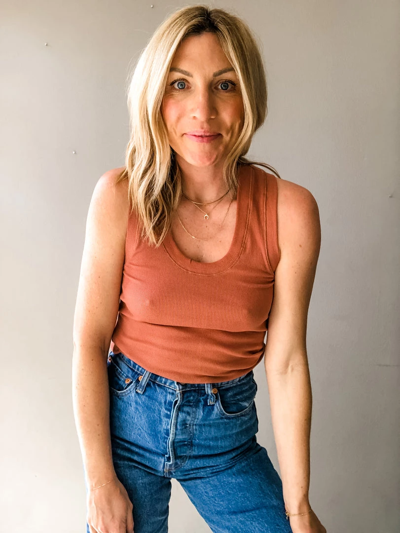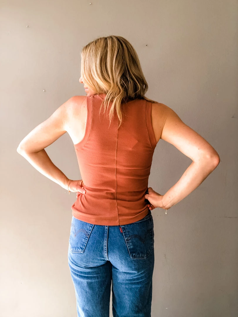 A cotton spandex rib knit tank that is a summer staple! Layer under overalls or pair with high waisted denim. This tank is so easy to pair and wear year round.