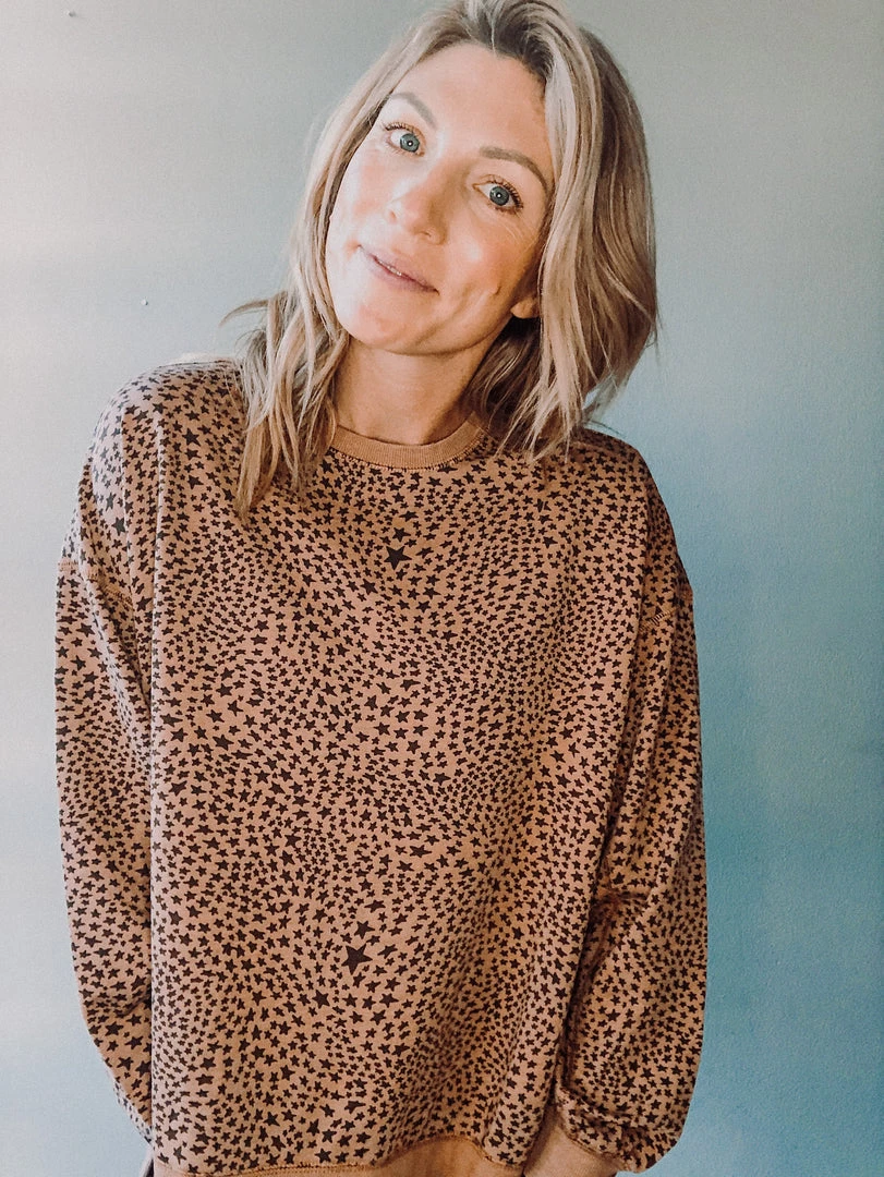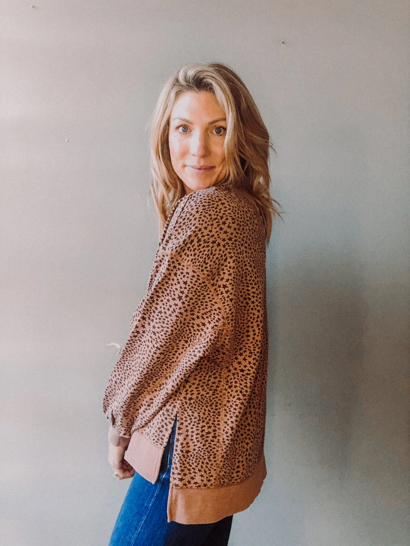 An oversized fitting pullover with with crew neck and side slits. the popular weekender is back in fun stardust pattern with contrasting hem. In a forever favorite burnout fabric that will age over time, the weekender is perfect for lounging or pairing with denim. A season staple you are sure to love.