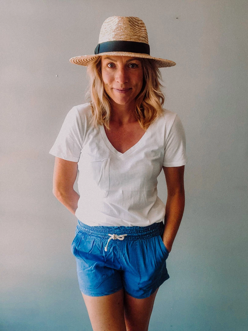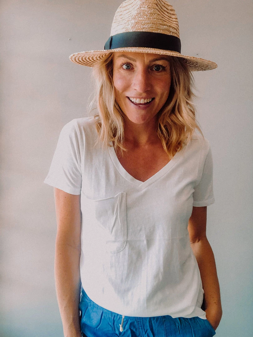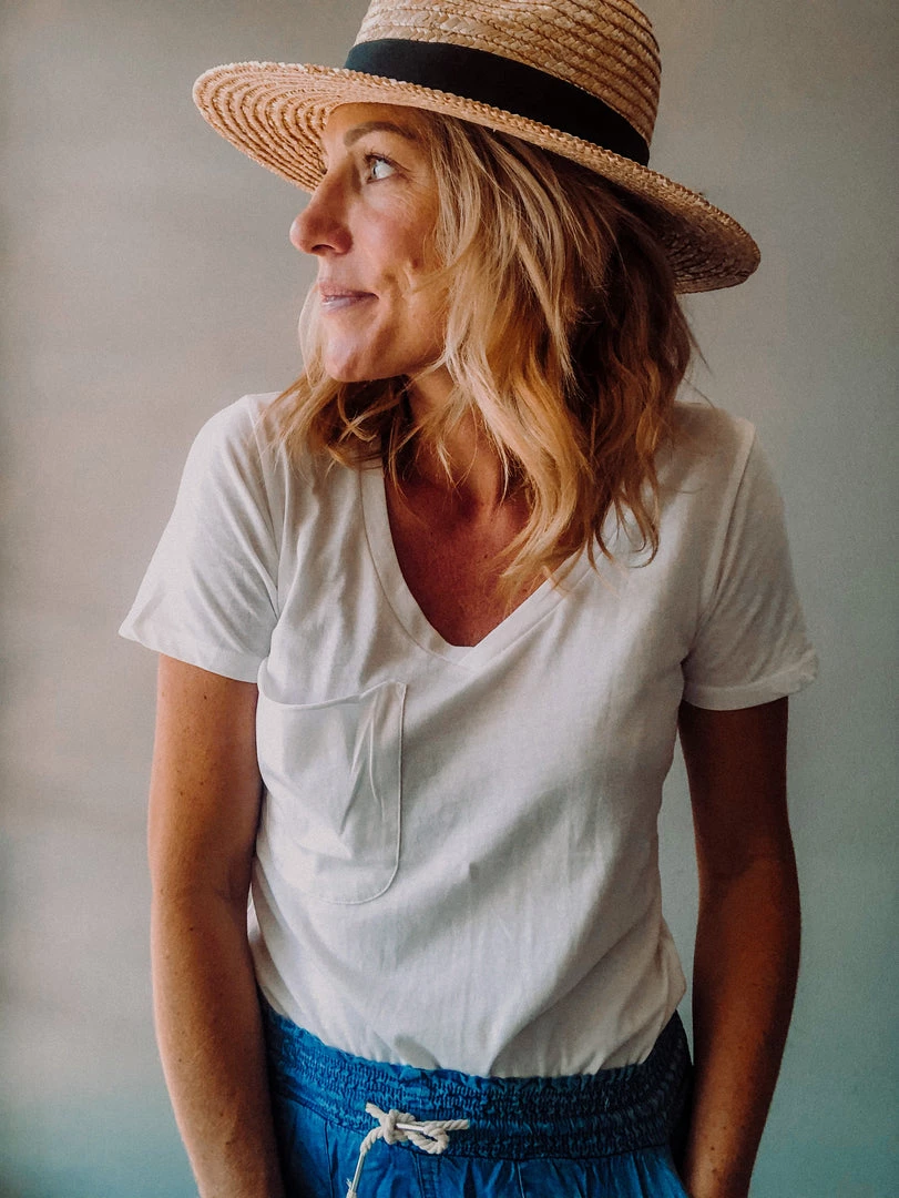A best selling pocket tee that is a staple in everyone’s closet. A burnout jersey fabric v-neck tee with pocket, curved hemline, and a broken in feel that will make you want to live in this shirt. Super easy to wear for lounging, paired with denim shorts or tucked in under a blazer for work.