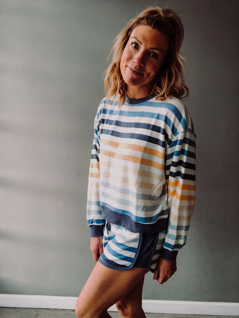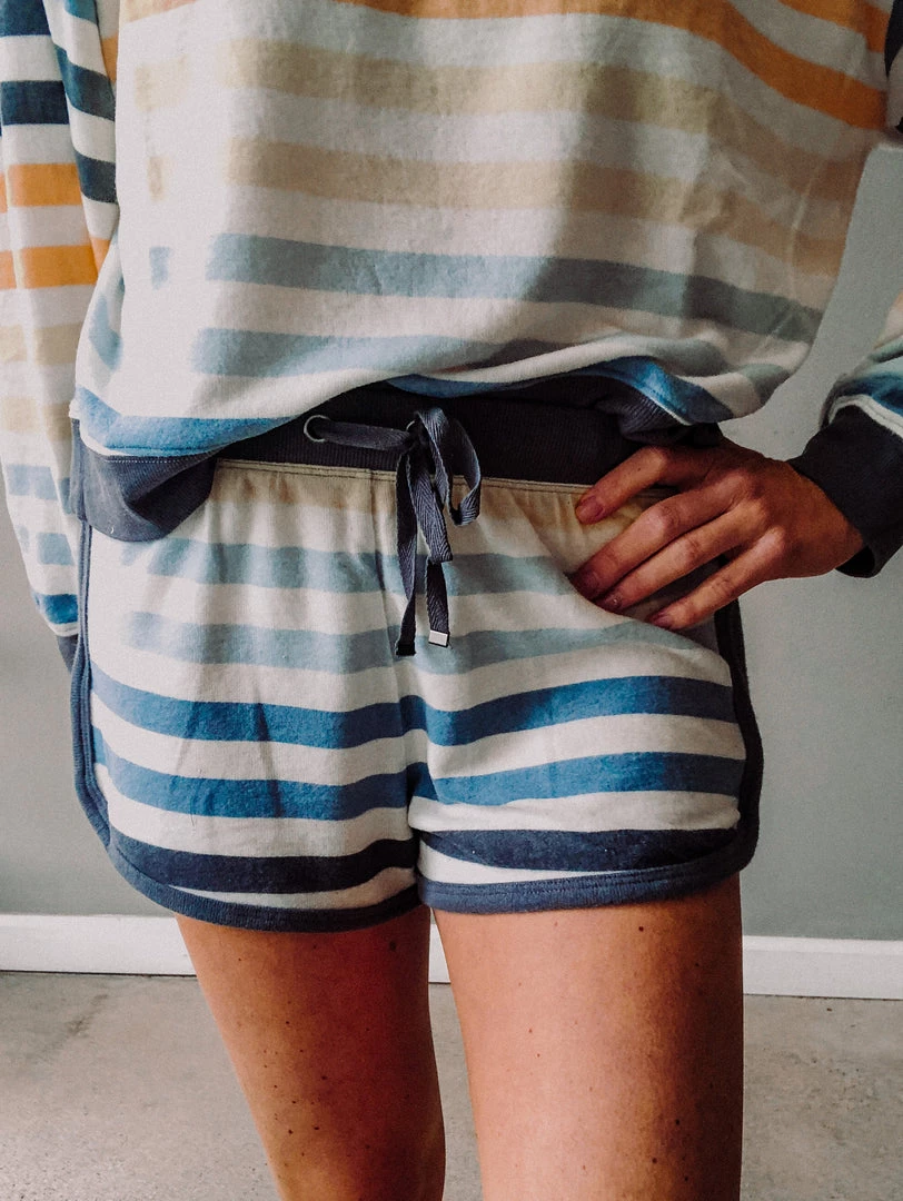 These cozy and colorful shorts are the ultimate for lounging. A brushed sweater knit fabric with scallop side hem, elastic waist and drawstring. You will love how cozy these shorts are. Pair with a white tee or complete the set with a matching pullover.