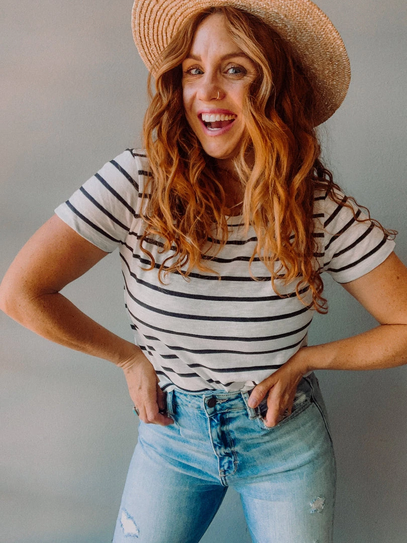 A striped tee is always a yes for us. But this one. Is. so. good. A slighlty longer cropped fit with a crew neckline, a loose, boxy fit and the perfect lenght for tucking into all your high rise denim! We love a great basic and this falls into our list of must haves.