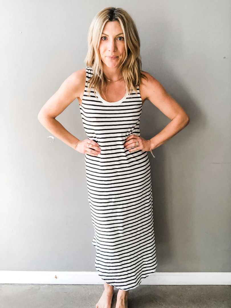 A scoop neck midi dress is a fan favorite horizontal black and white stripe. A soft cotton jersey knit fabric in a relaxed fit, and super comfortable silhouette that is a summer staple. Easy to pair and wear from day to night.