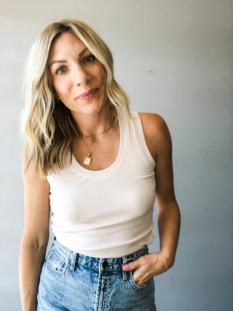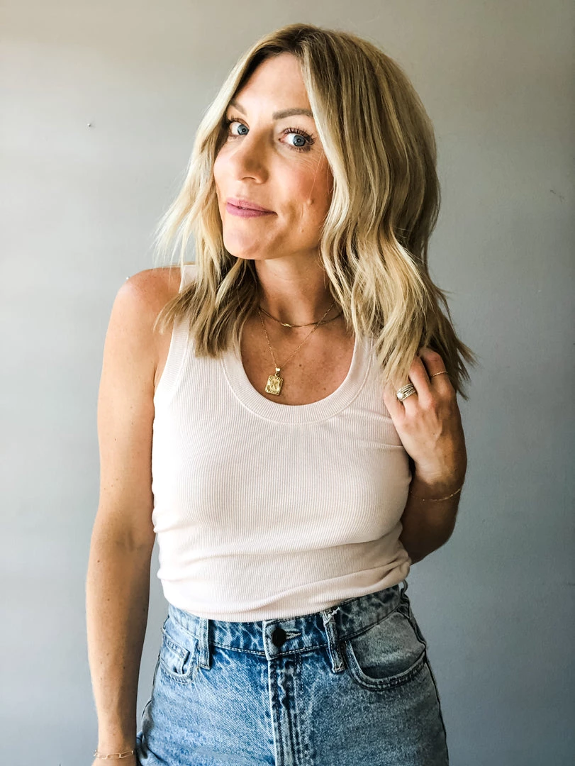 A cotton spandex rib knit tank that is a summer staple! Layer under overalls or pair with high waisted denim. This tank is so easy to pair and wear year round.
