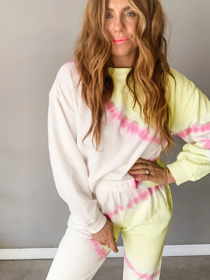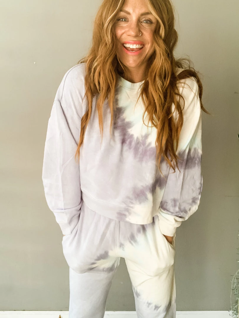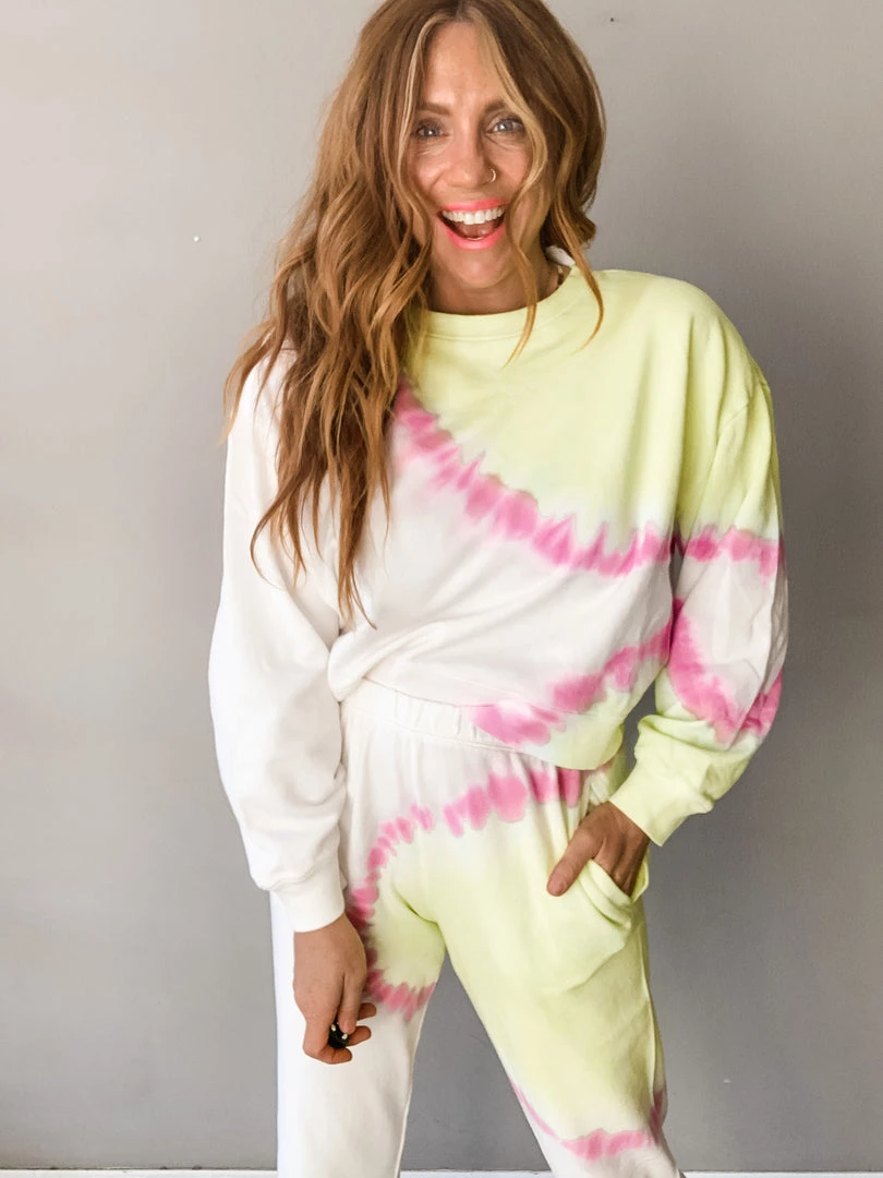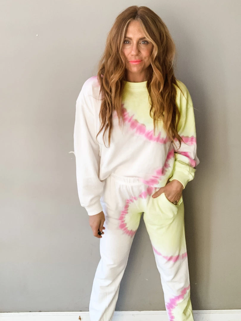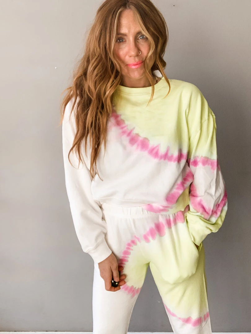 The Sunburst Tie Dye Jogger is a DELICIOUS, very cozy jogger style sweat pant with side pockets and a thicker elastic waistline and ankle hem. A fun starburst tie print, available in two colorways. Fits true to size.