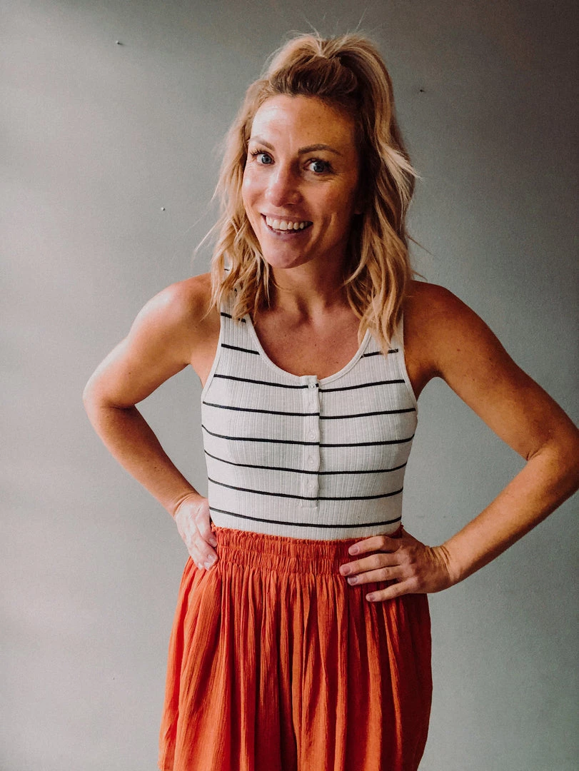 A classic stripe on a ribbed bodysuit perfect for layering. Made with a super soft fabric, this round neck bodysuit has front buttons, snap closure at the crotch and a thong style bottom. Layer with denim, shorts or your fav midi skirt. This bodysuit is great for completing any look.