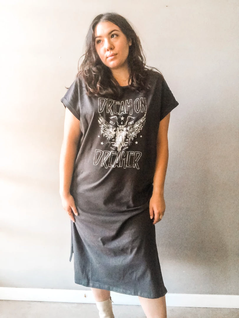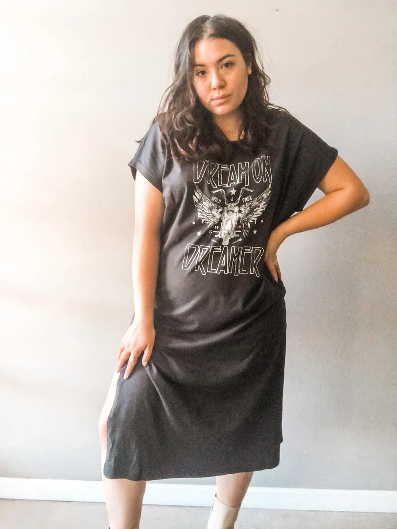 The Dream on Dreamer Midi is a bestseller…restocked in a new color way!! This simple black, t shirt style midi dress has a vintage vibe with high side slits and a cozy, easy fit Tie a flannel around your waist, throw on some sneaks, and you’re set!
